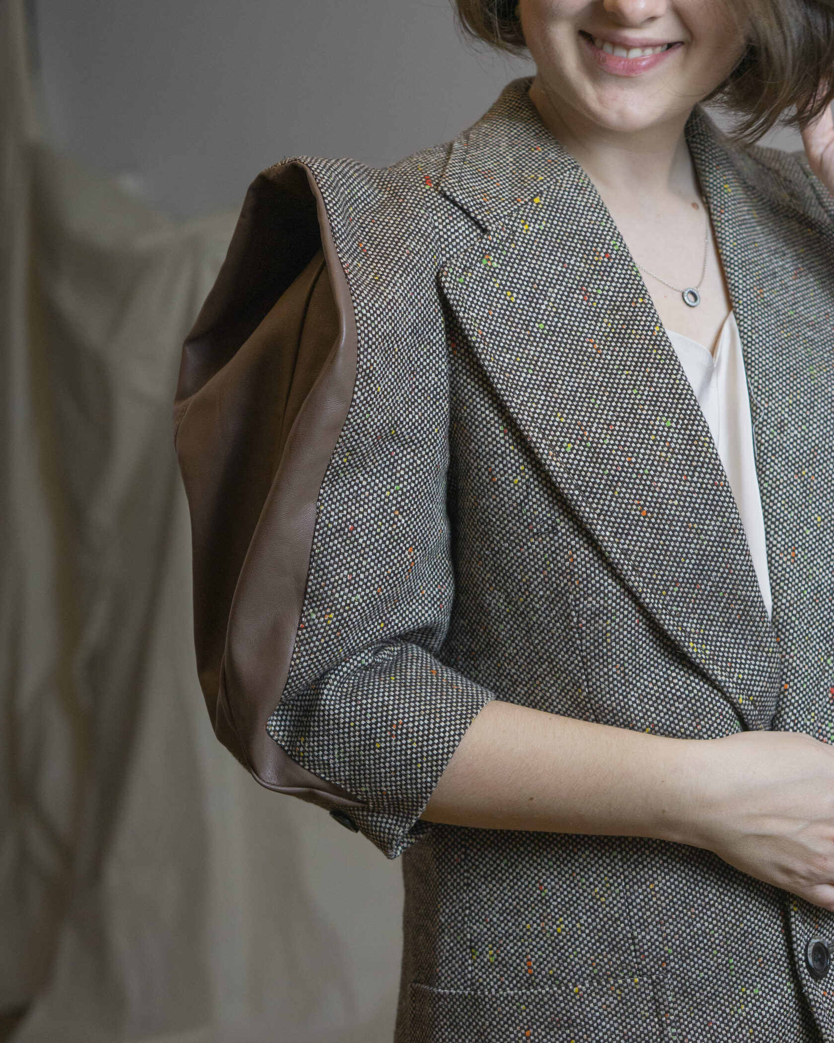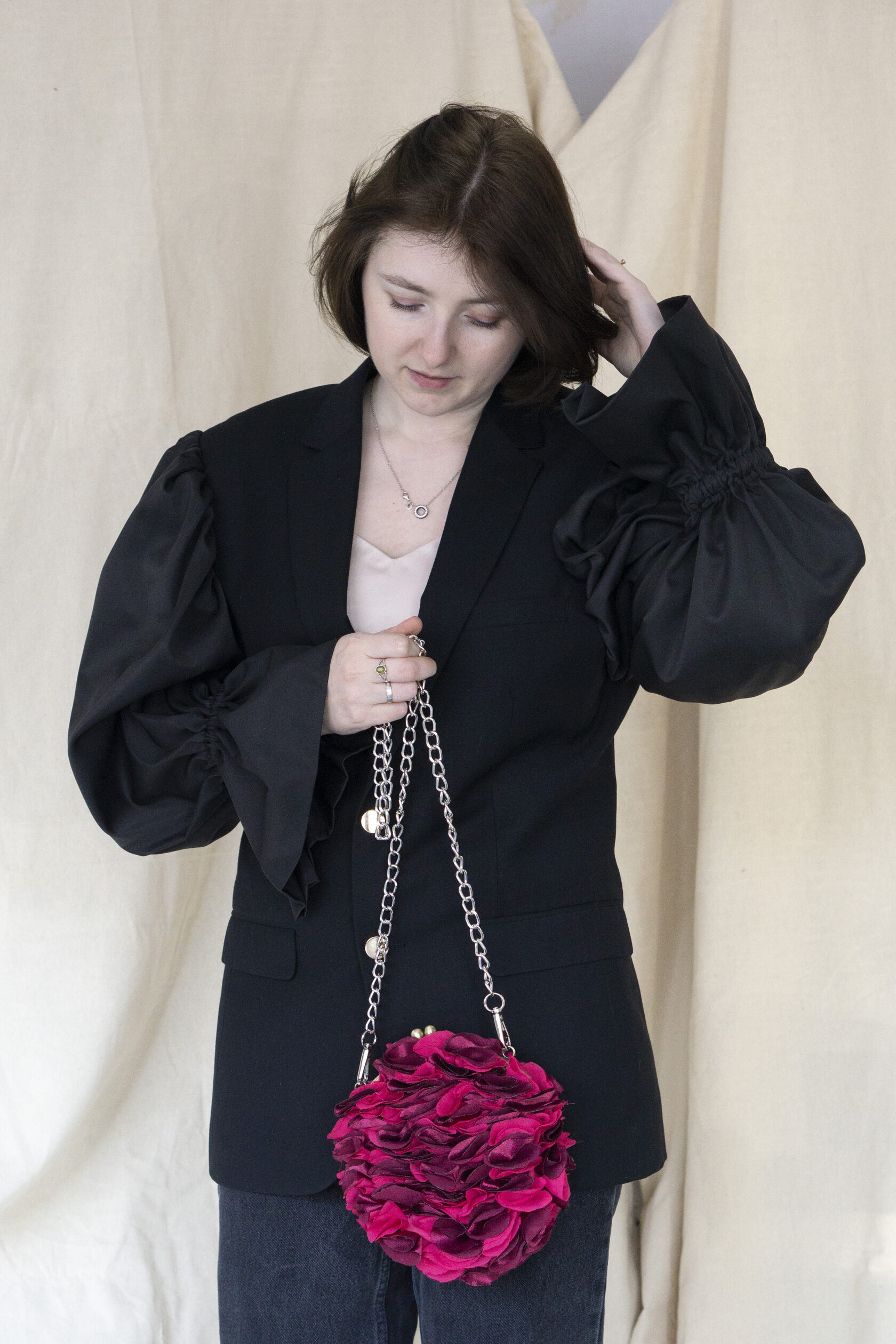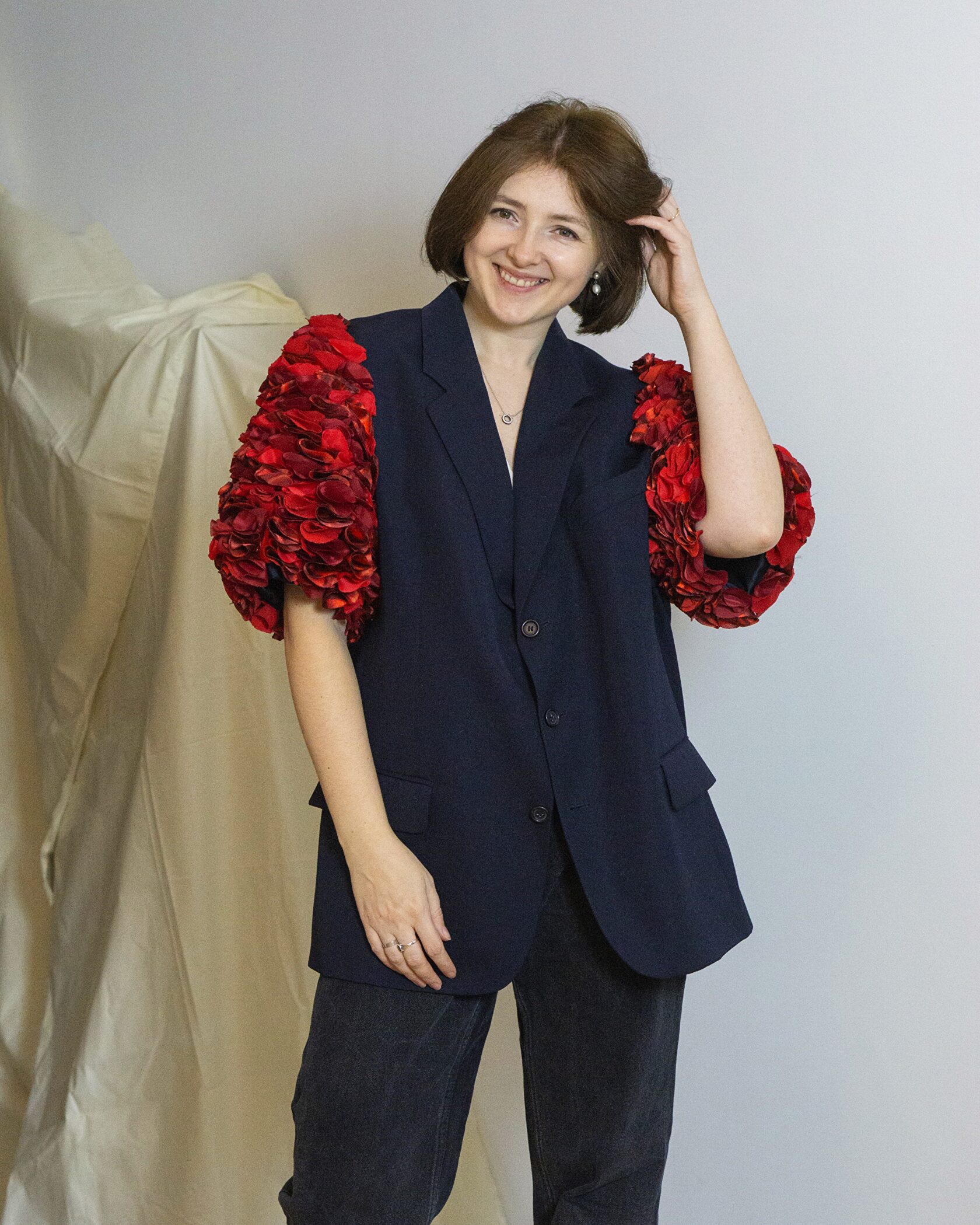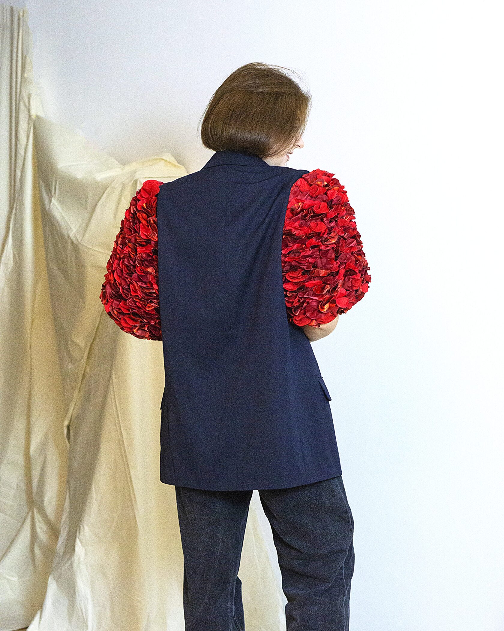 Ręcznie wykonana marynarka powstała w duchu upcyclingu i zrównoważonej mody. Klasyczny, lekko wydłużony fason został uzupełniony o wyraziste, objętościowe rękawy, które nadają projektowi nowoczesny, modowy charakter.
