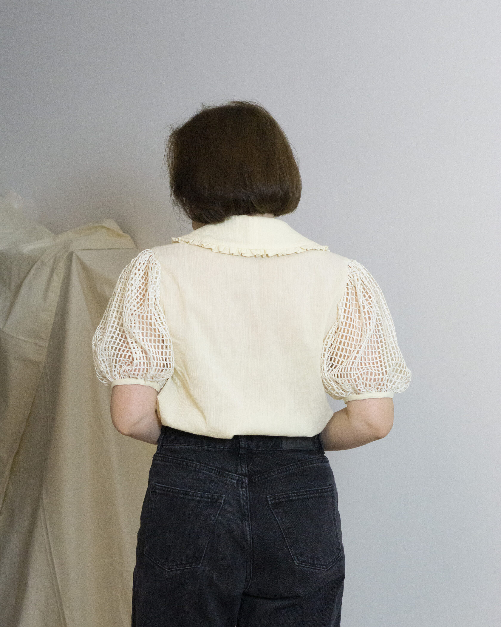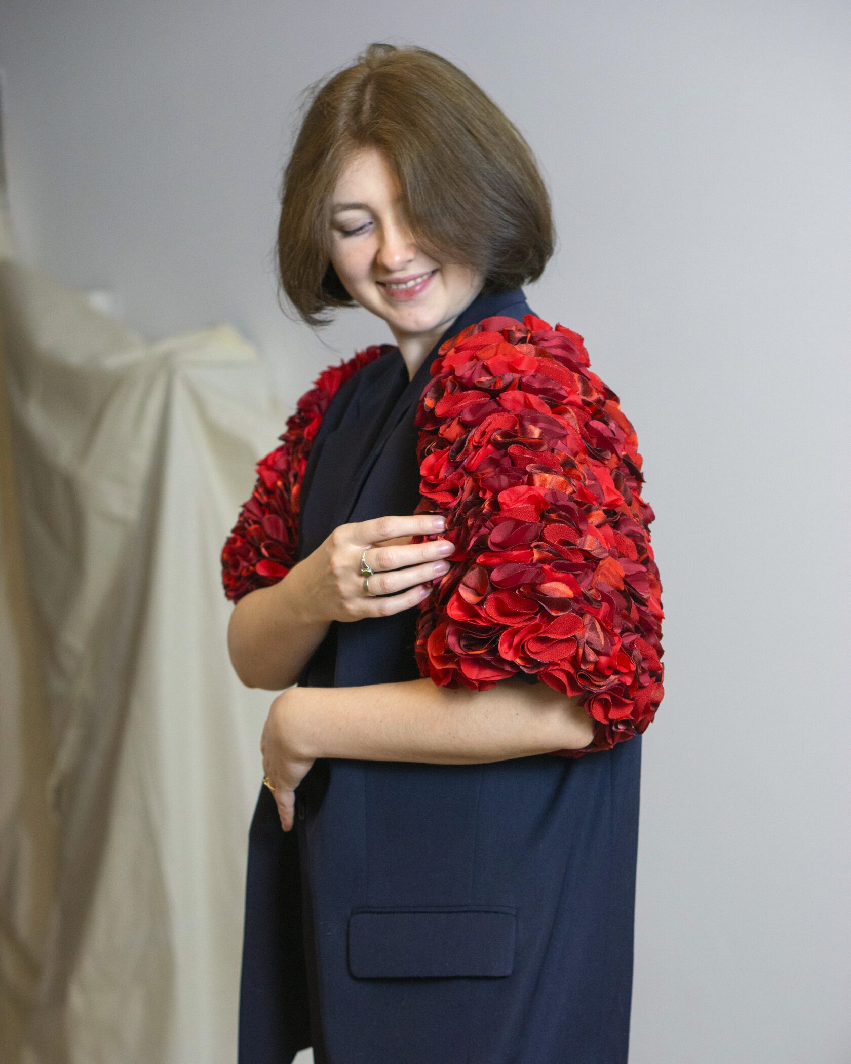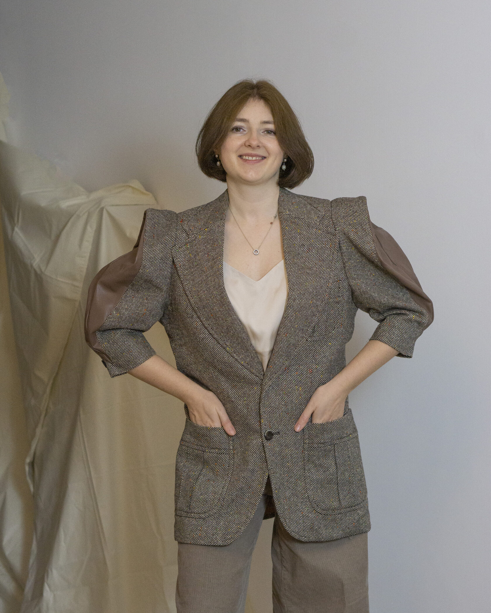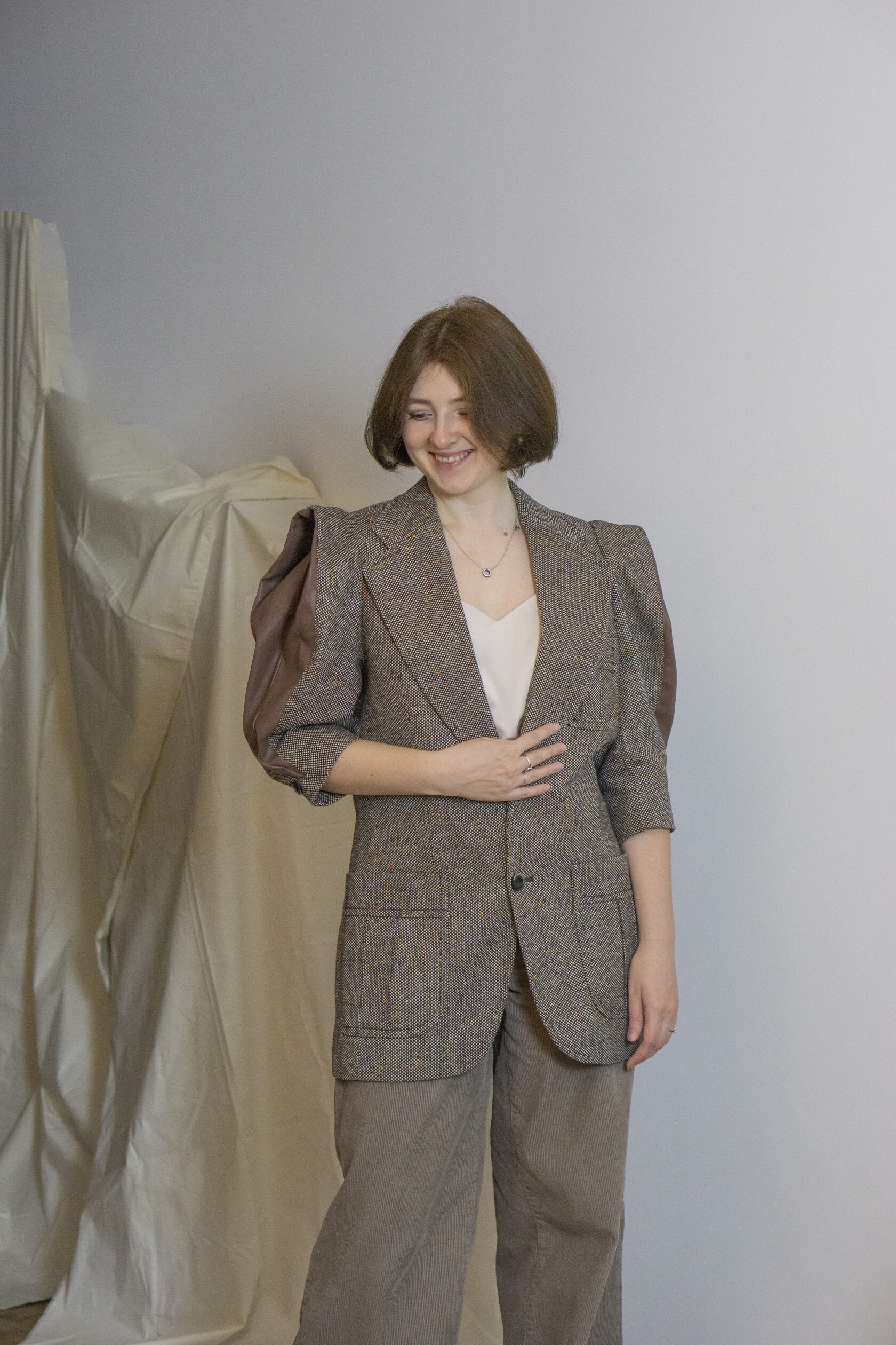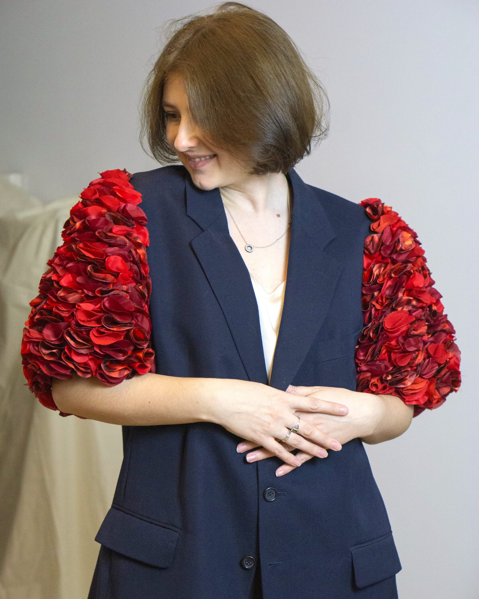 Ręcznie wykonana marynarka powstała w duchu upcyclingu i zrównoważonej mody. Klasyczny, lekko wydłużony fason został uzupełniony o wyraziste, objętościowe rękawy, które nadają projektowi nowoczesny, modowy charakter.