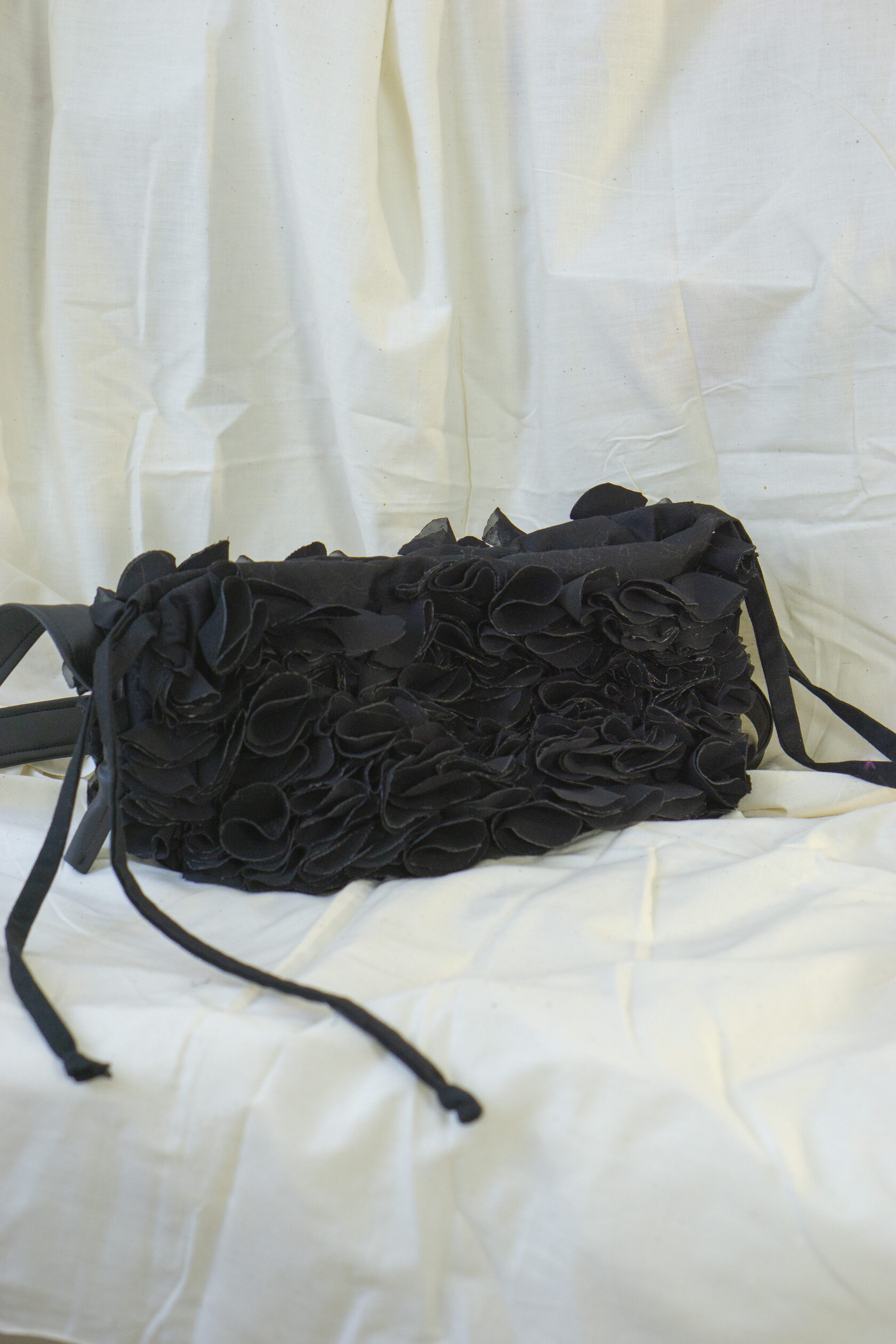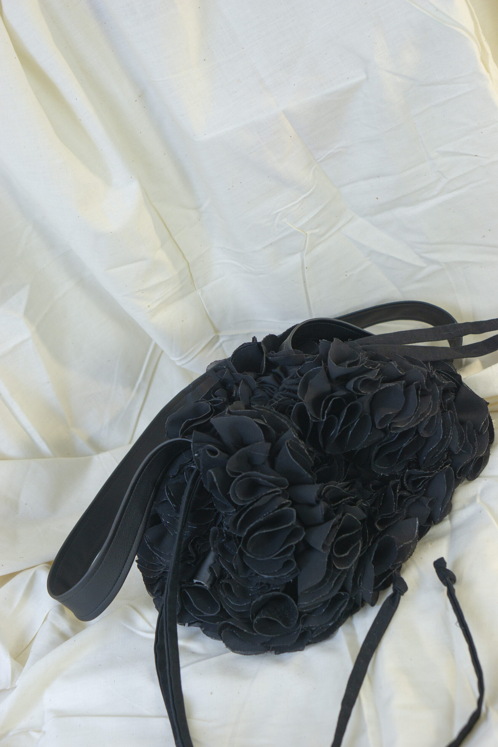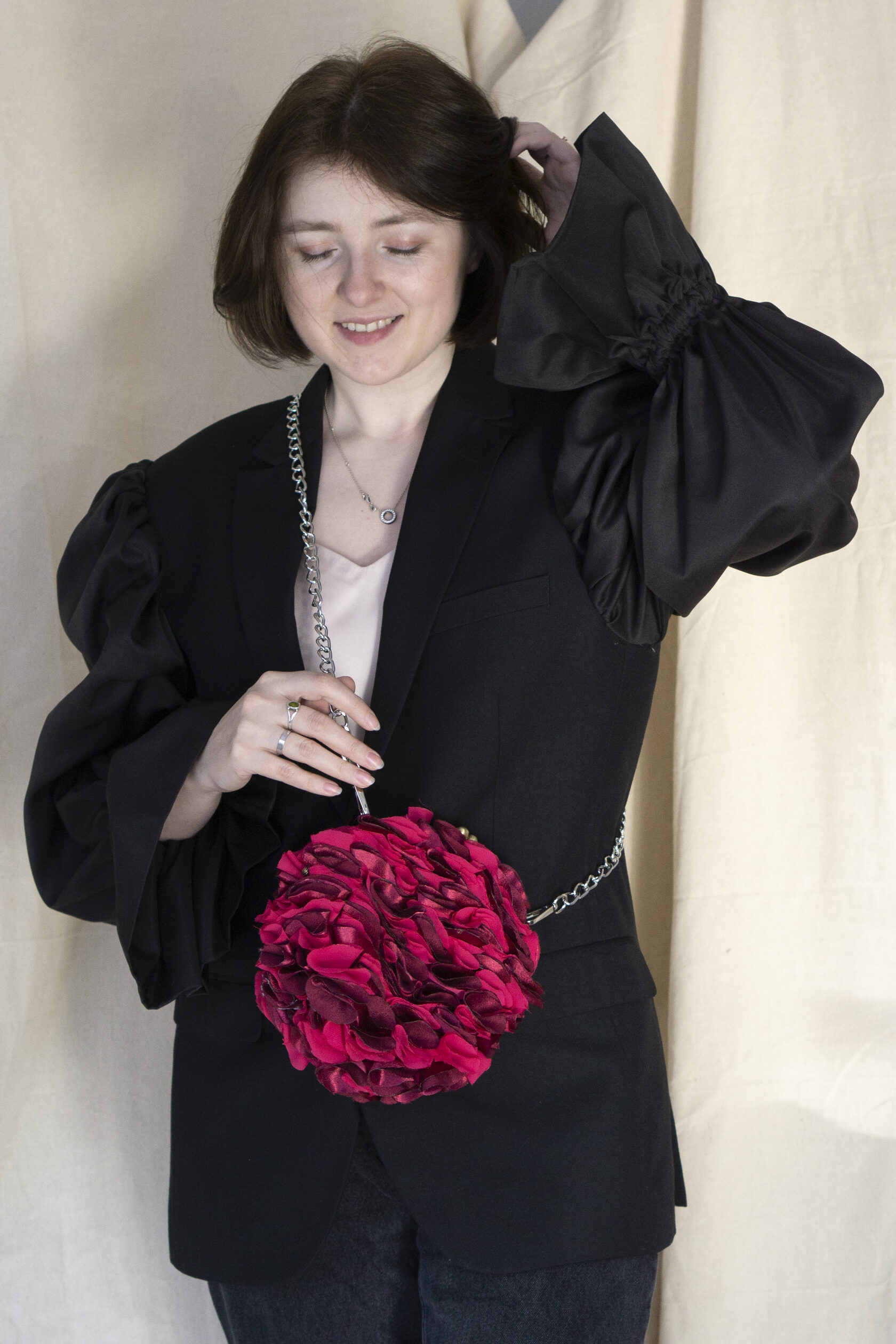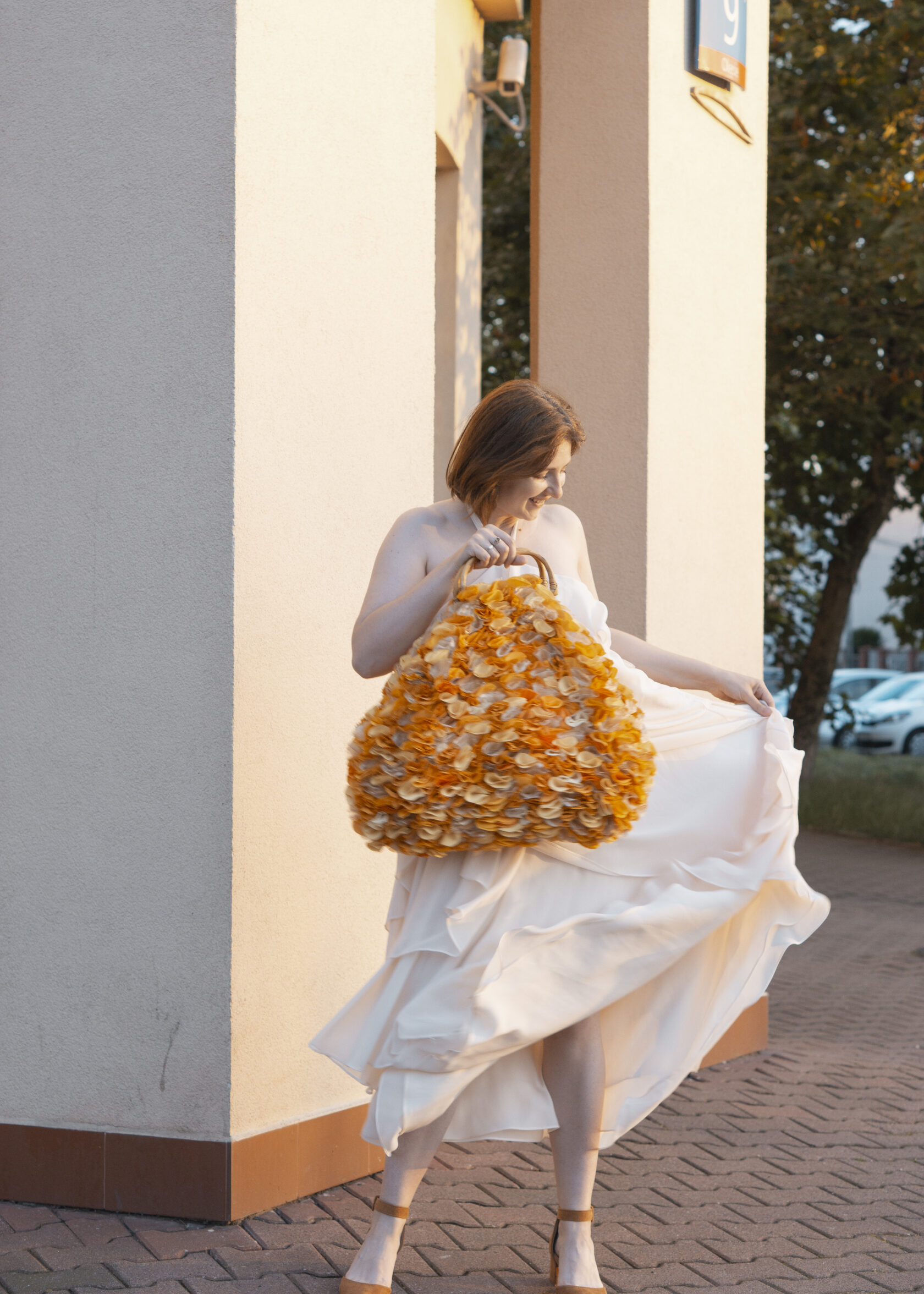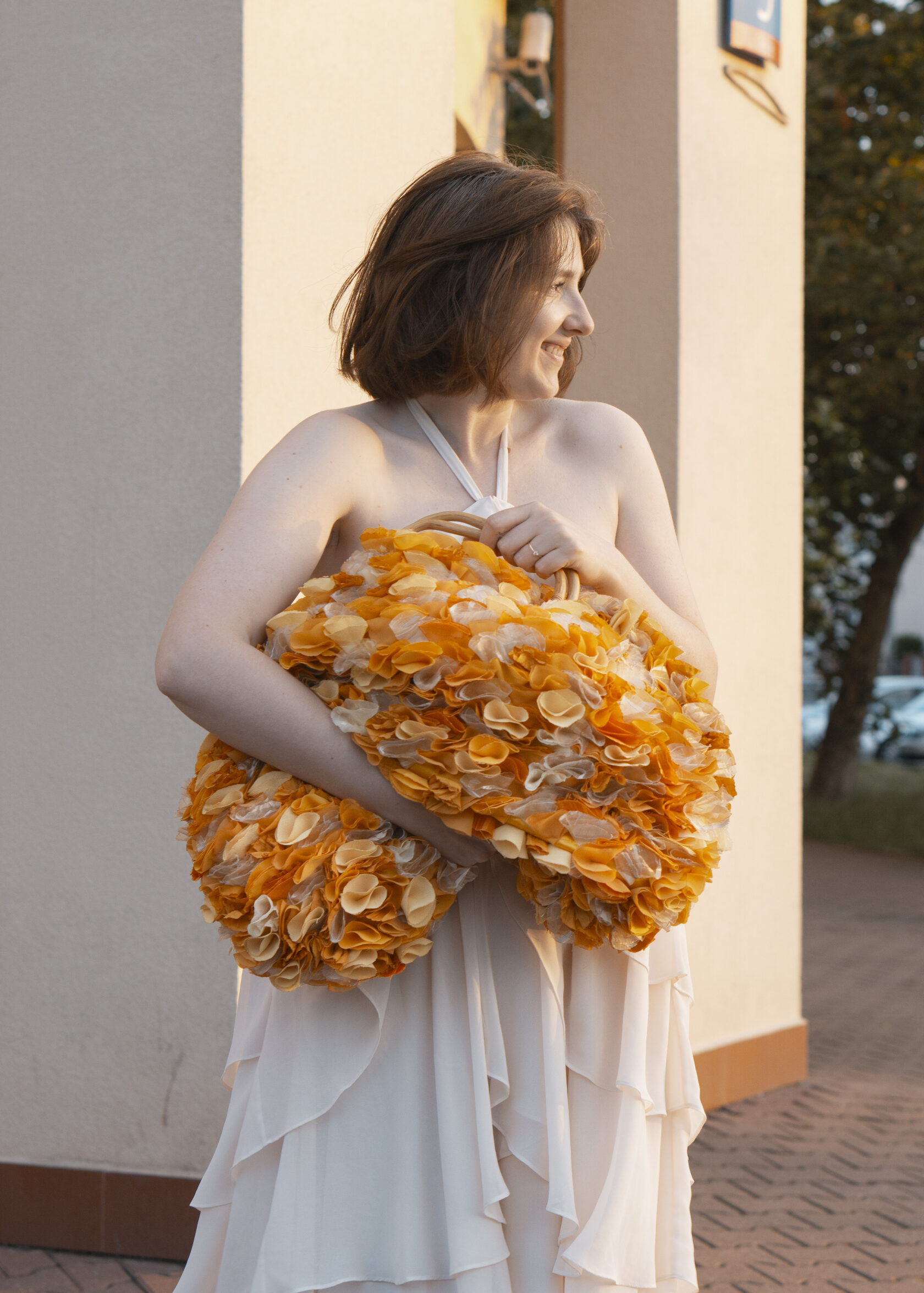 Ręcznie wykonana z upcyklingowanych okrągłych elementów tkaniny, które tworzą unikalną, zabawną i elegancką fakturę. Każdy detal podkreśla kreatywność i świadome podejście do mody.