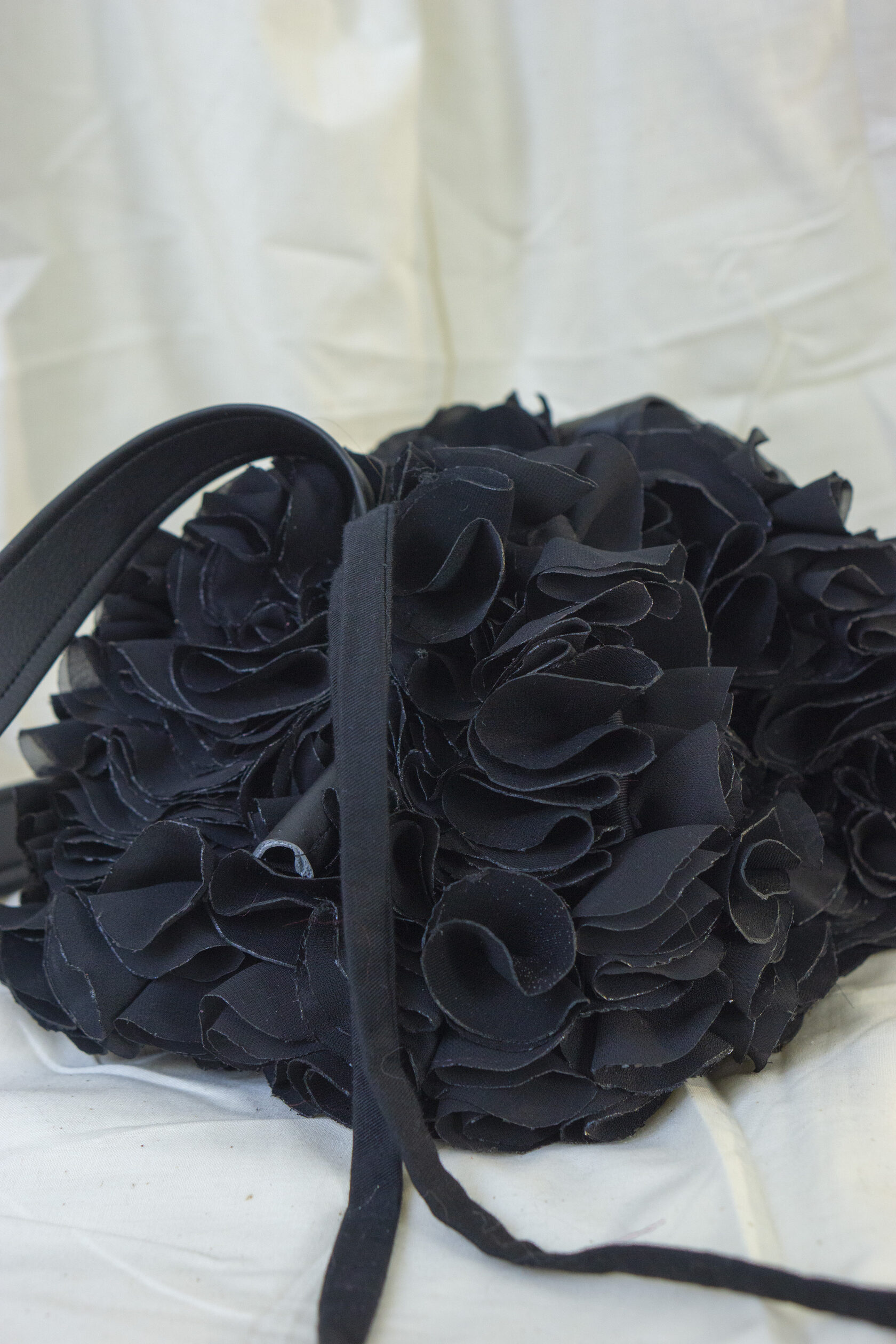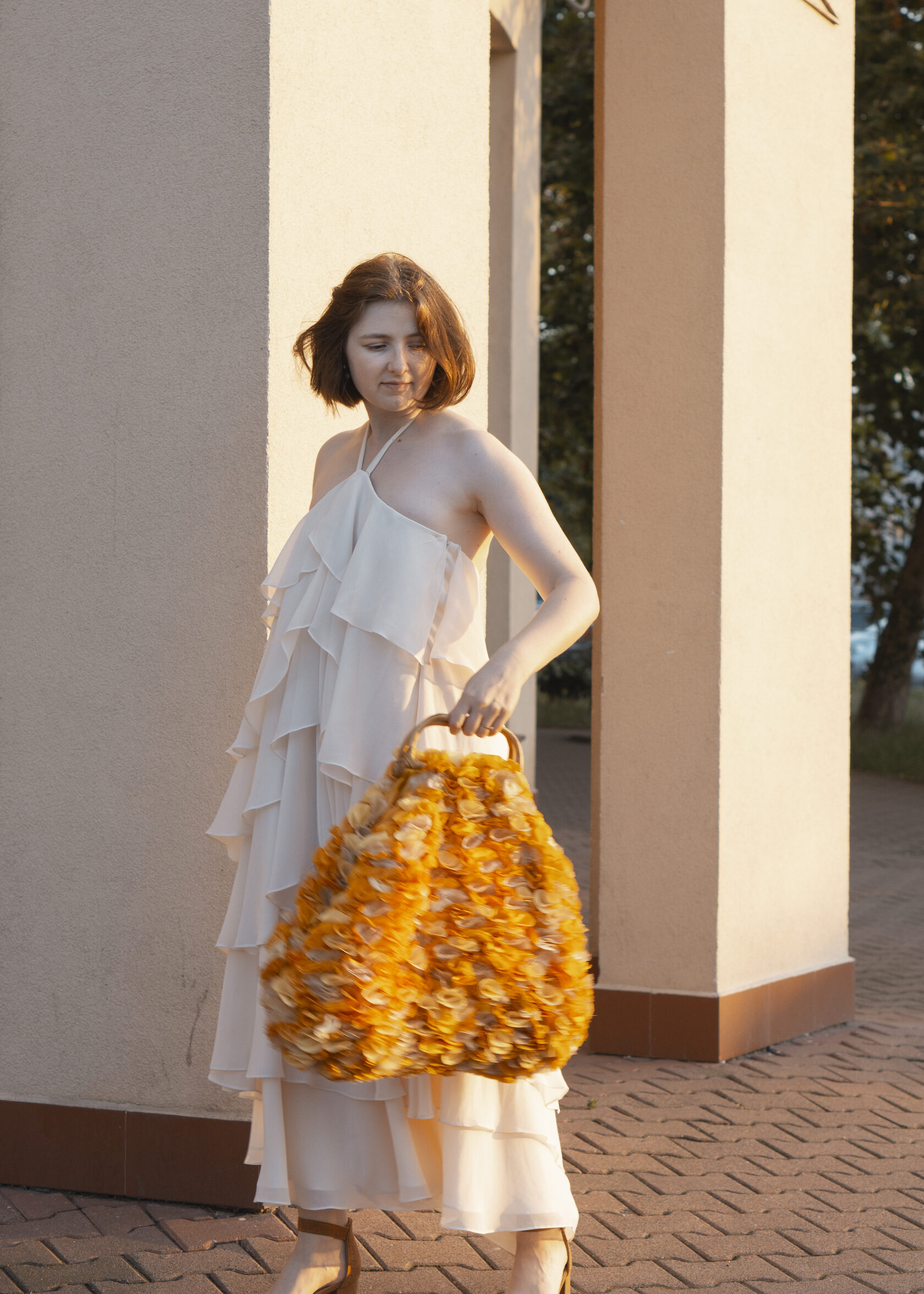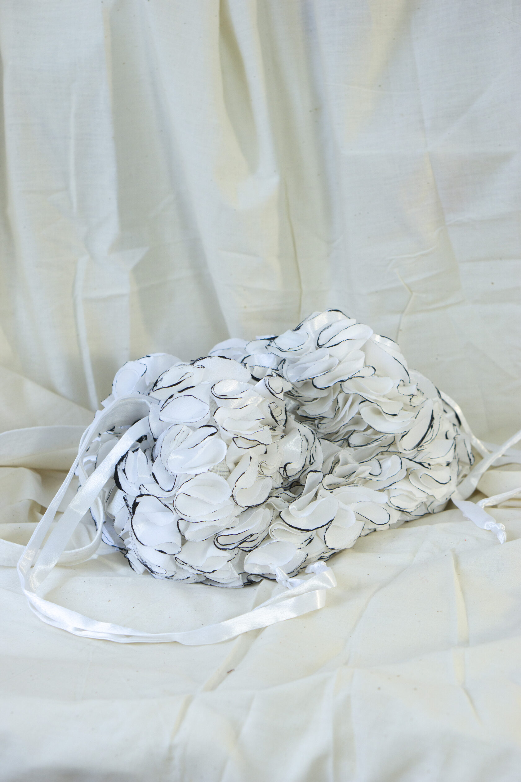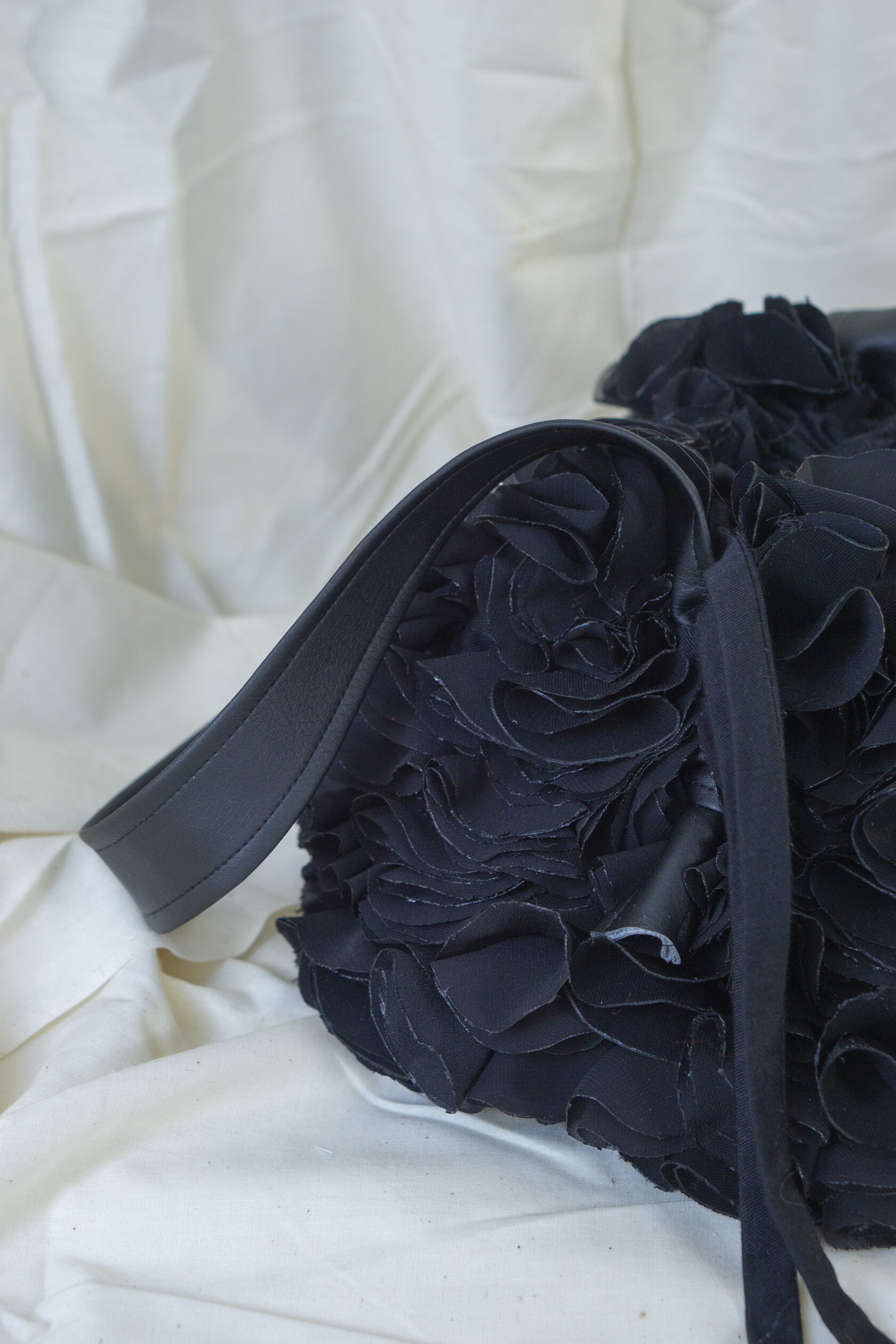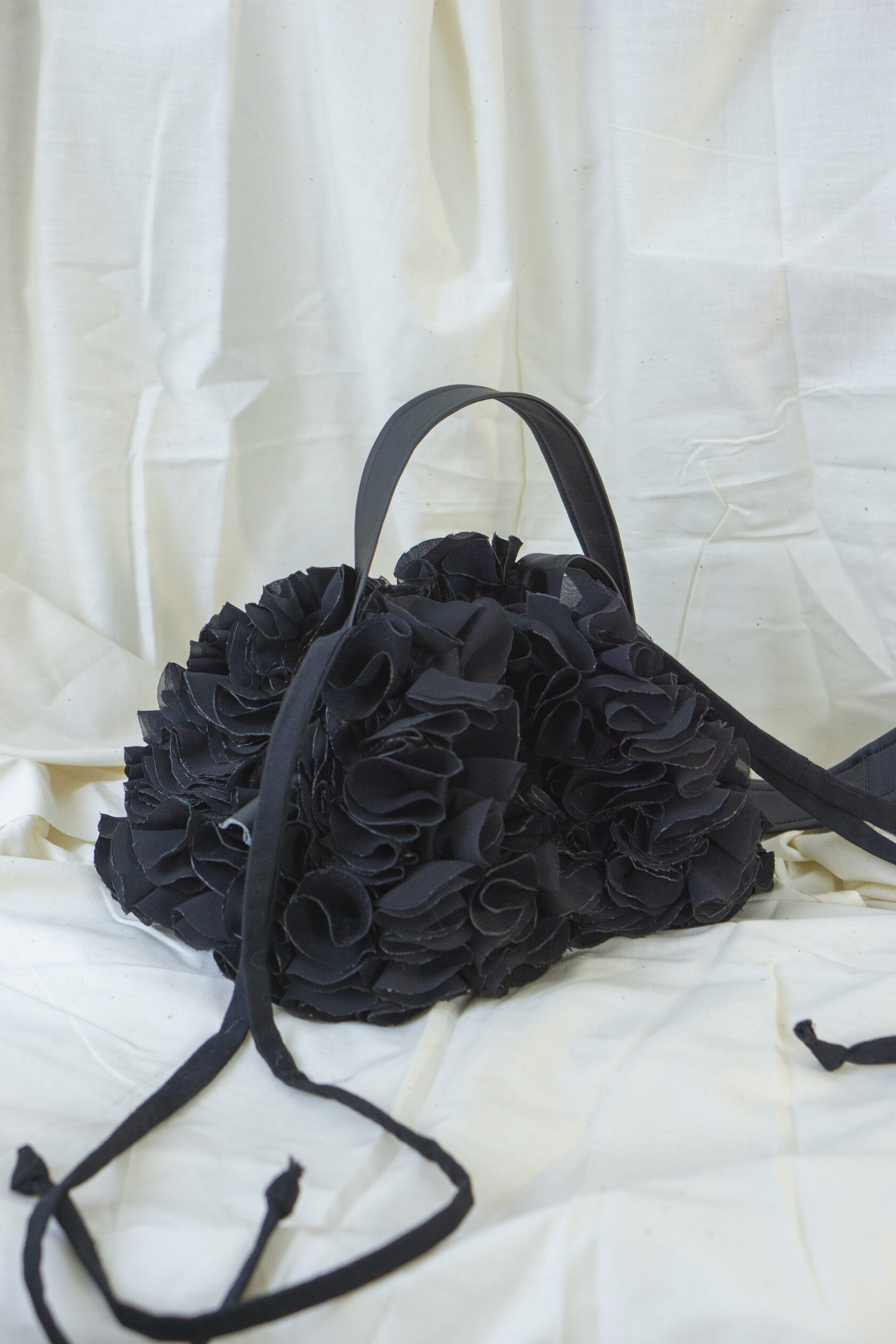 Ręcznie wykonana z upcyklingowanych okrągłych elementów tkaniny, które tworzą unikalną, zabawną i elegancką fakturę. Każdy detal podkreśla kreatywność i świadome podejście do mody.