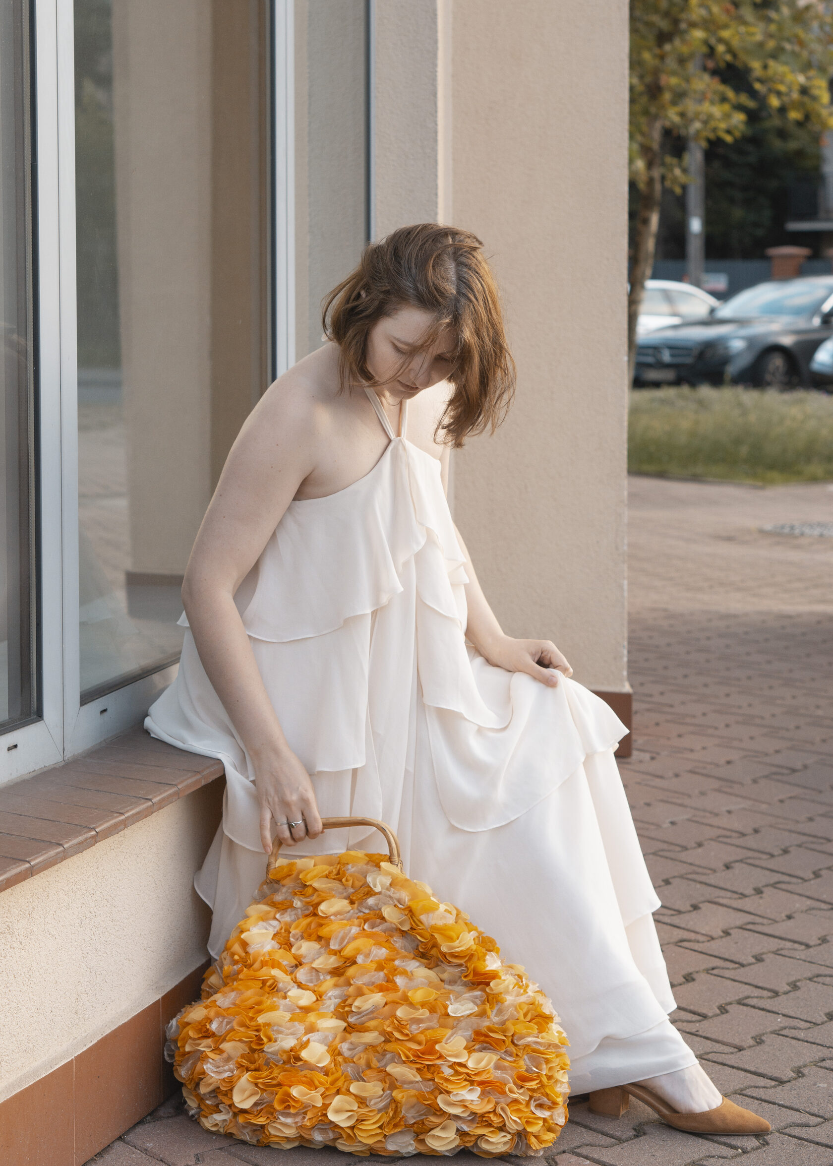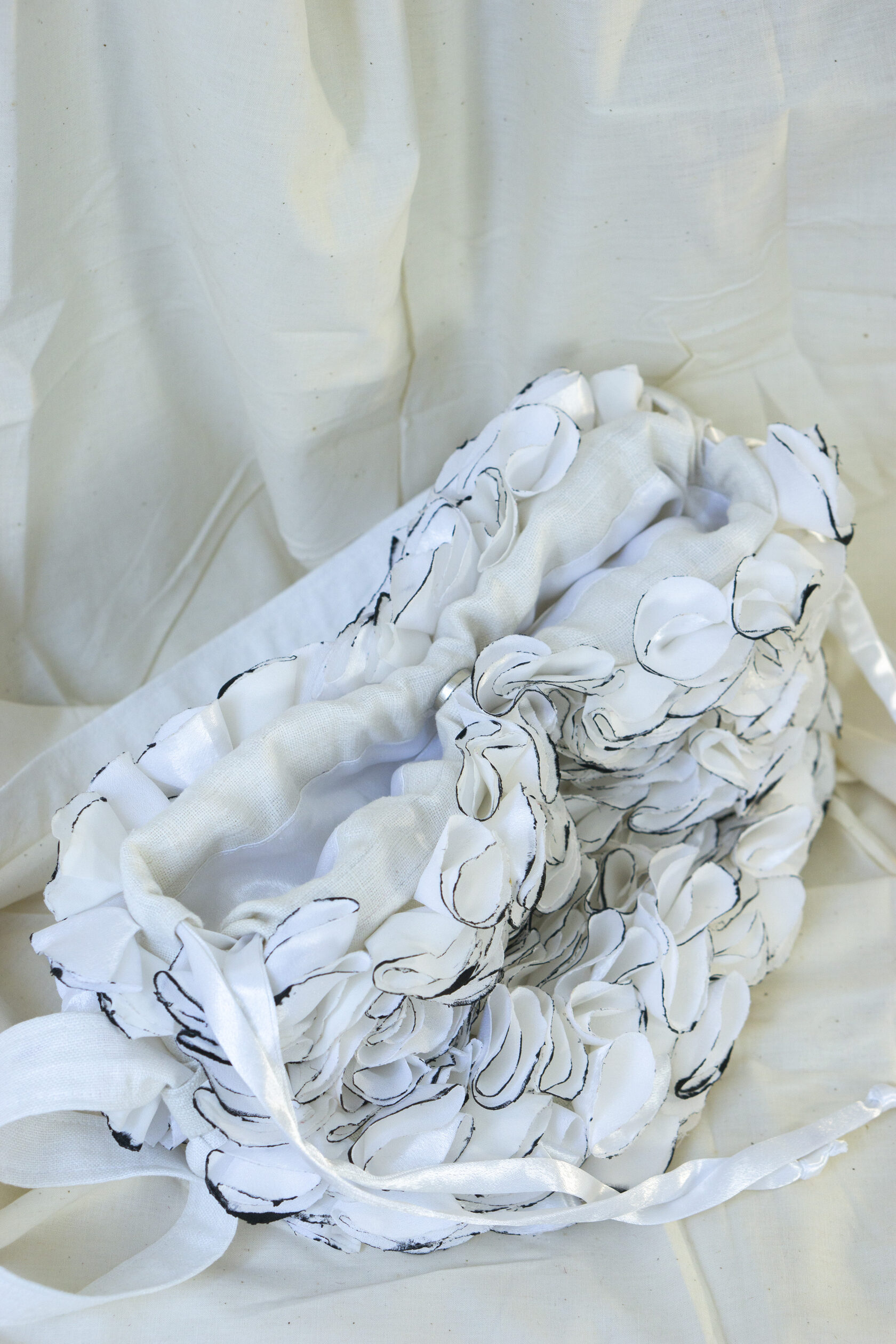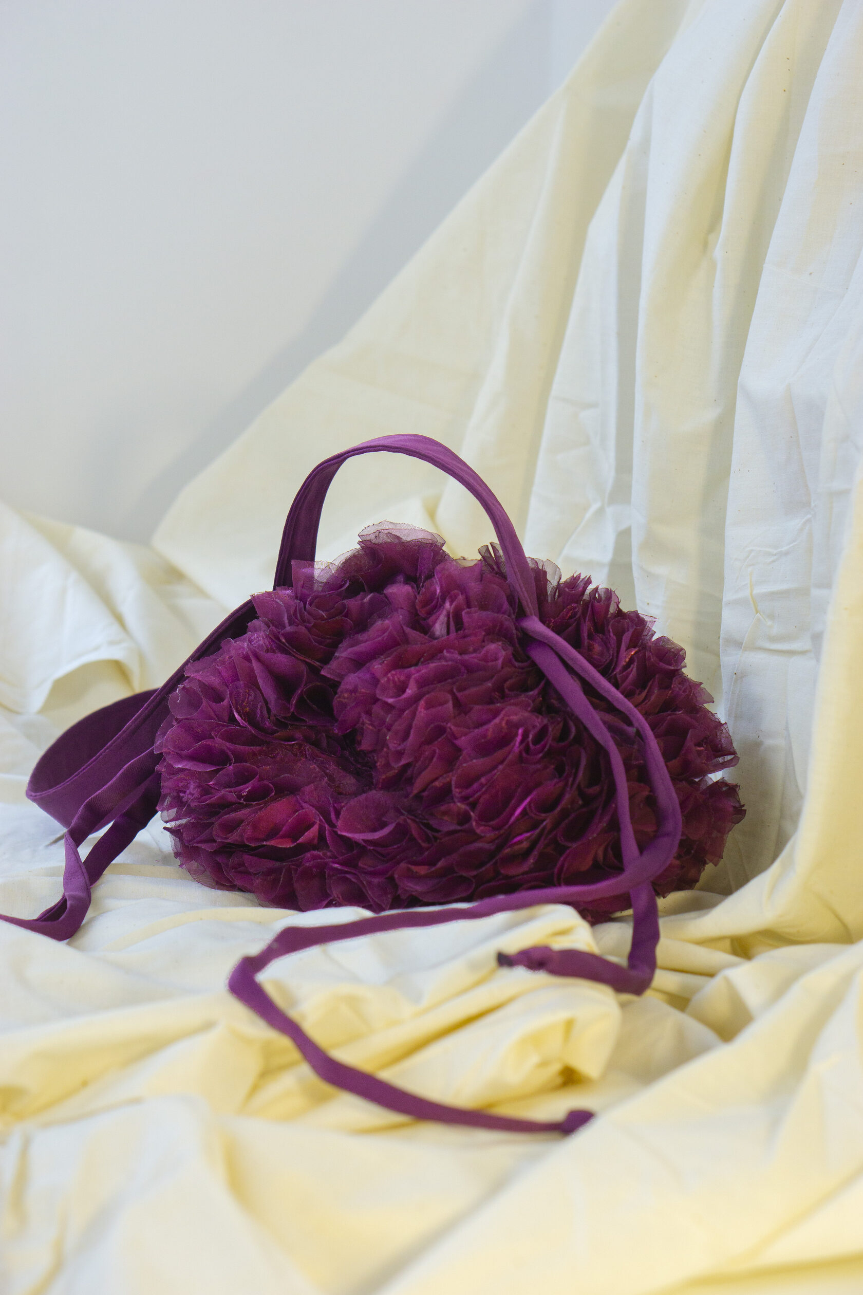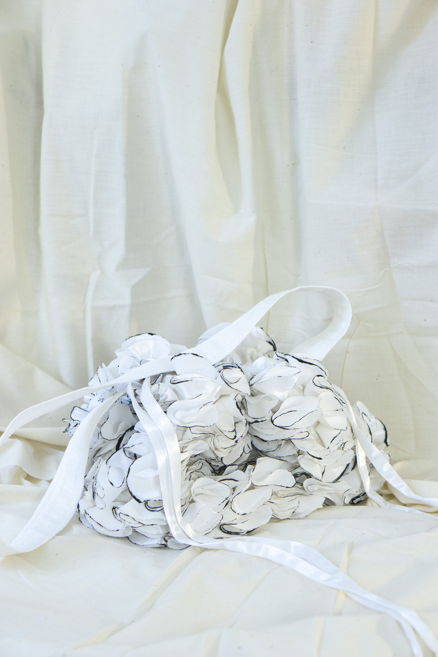 Ręcznie wykonana z upcyklingowanych okrągłych elementów tkaniny, które tworzą unikalną, zabawną i elegancką fakturę. Każdy detal podkreśla kreatywność i świadome podejście do mody.
