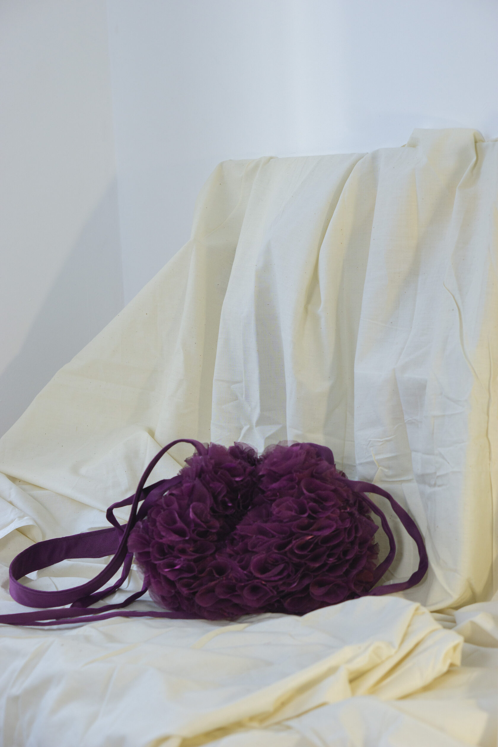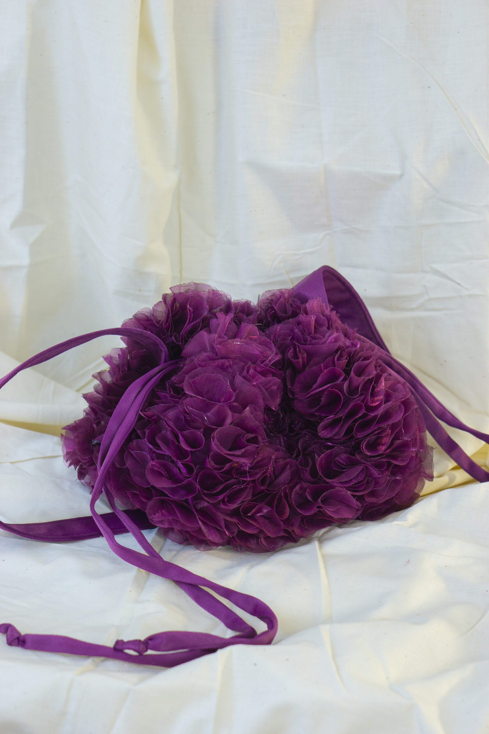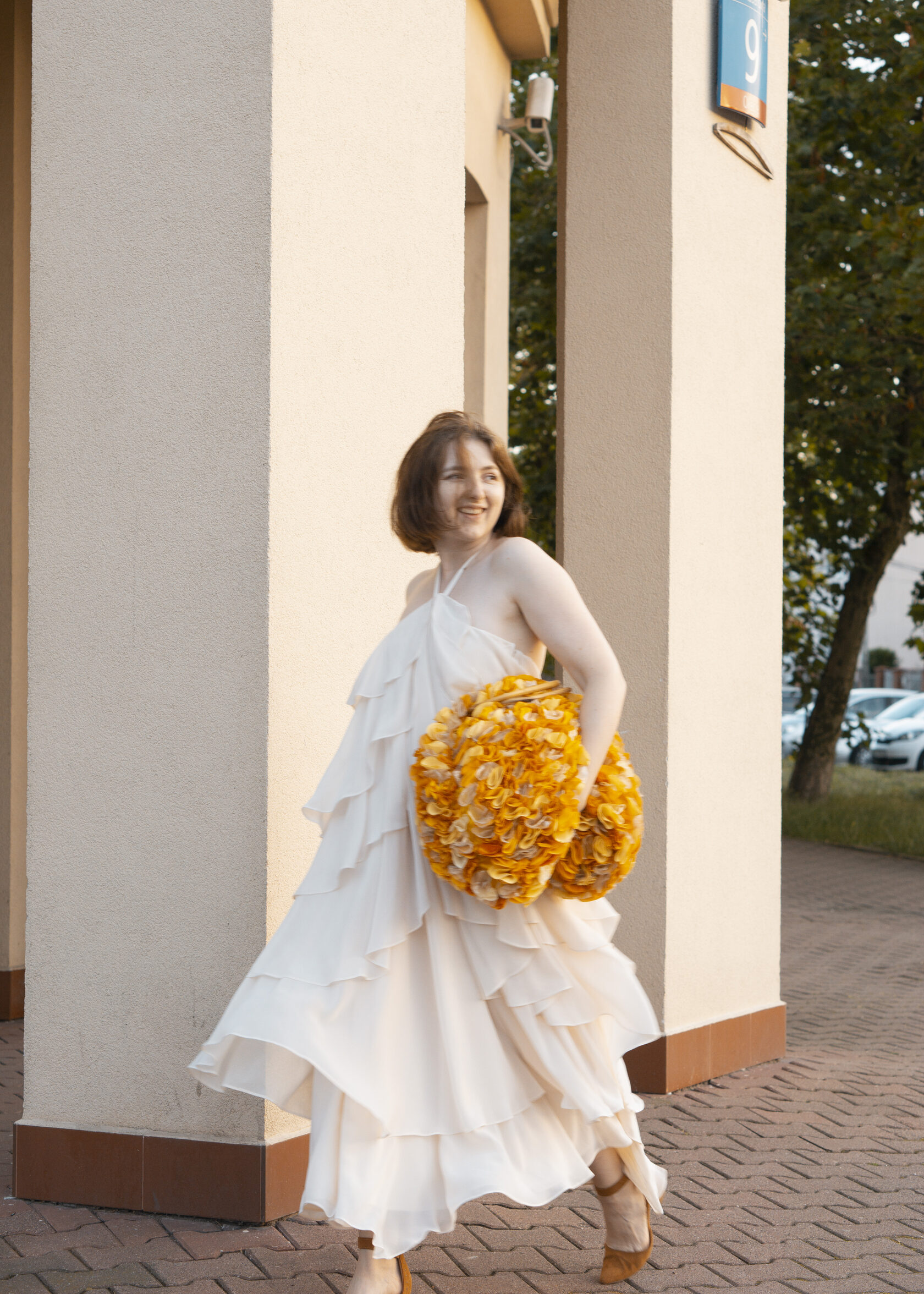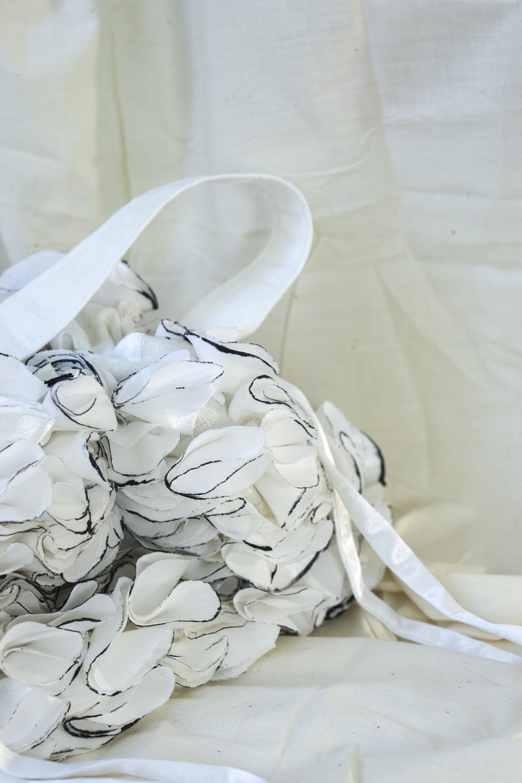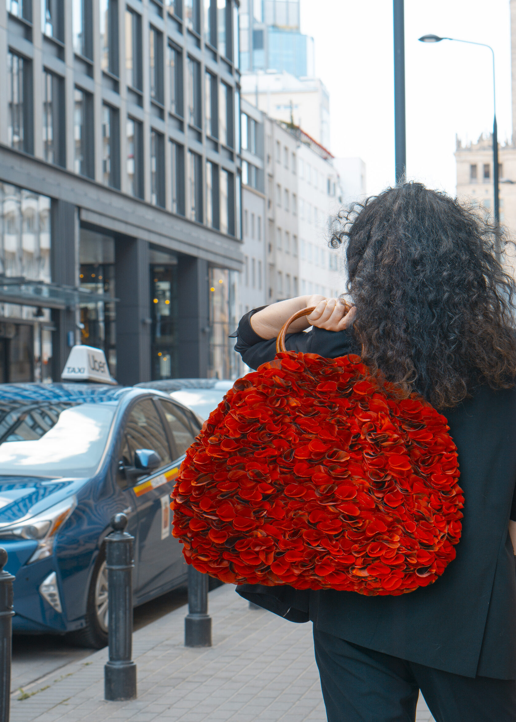 Ręcznie wykonana z upcyklingowanych okrągłych elementów tkaniny, które tworzą unikalną, zabawną i elegancką fakturę. Każdy detal podkreśla kreatywność i świadome podejście do mody.