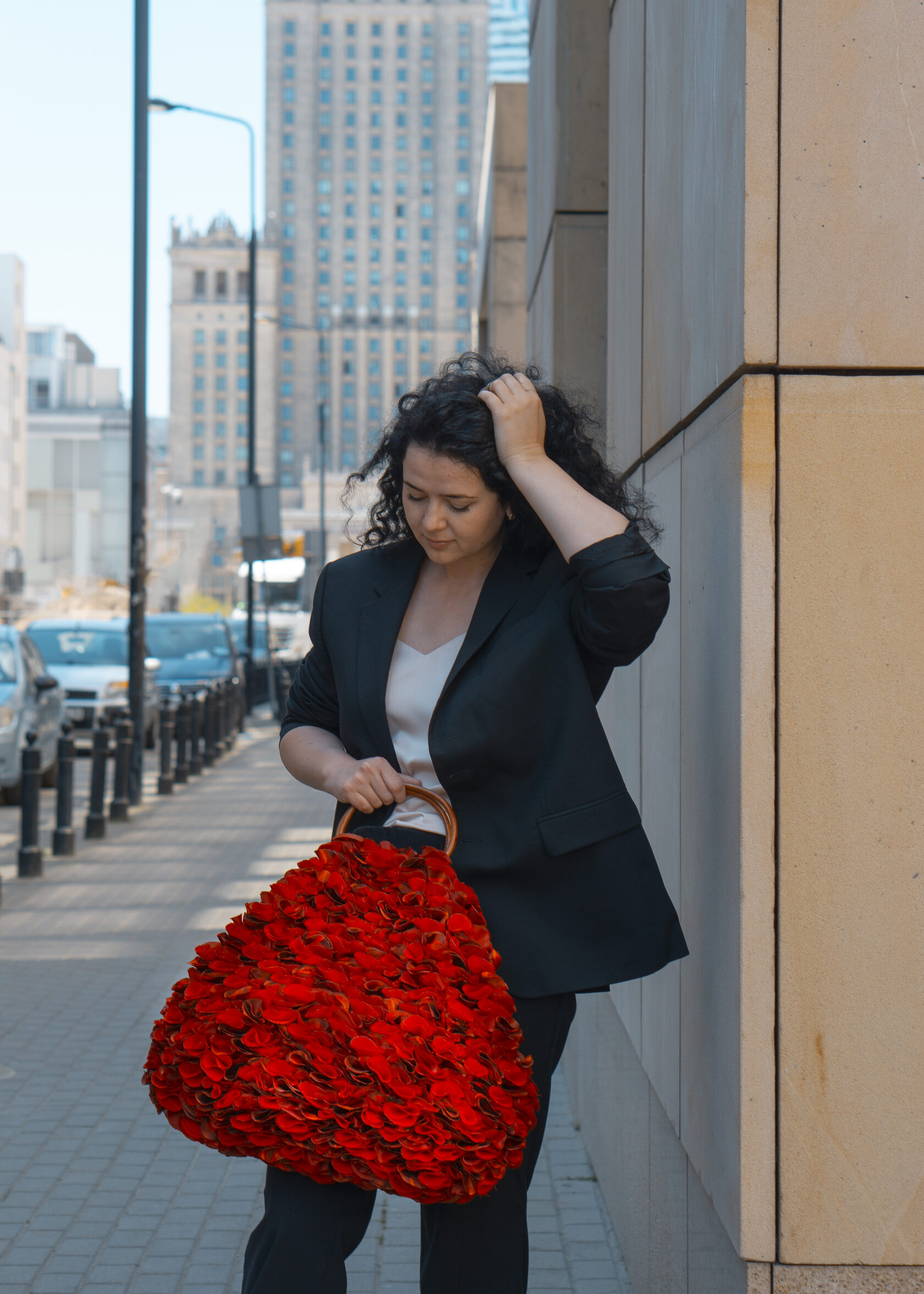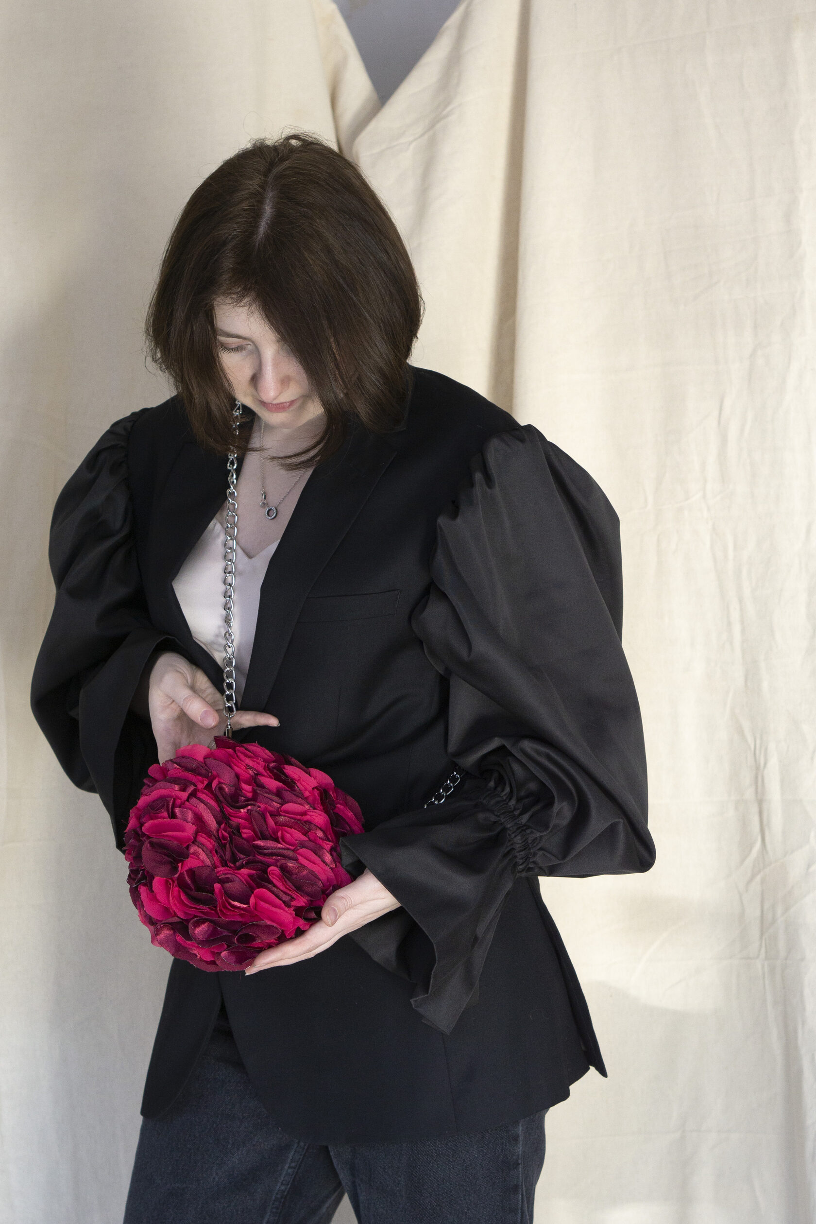 Ten czarny blezer z upcyklingu redefiniuje klasyczne krawiectwo przez odważną, artystyczną perspektywę. Wykonany z odzyskanych materiałów, łączy w sobie ideę zrównoważonego rozwoju i współczesną, rzeźbiarską sylwetkę. Pojemne rękawy dodają dramatyzmu i elegancji, zamieniając ponadczasowy element garderoby w prawdziwe dzieło sztuki, które można nosić na co dzień.