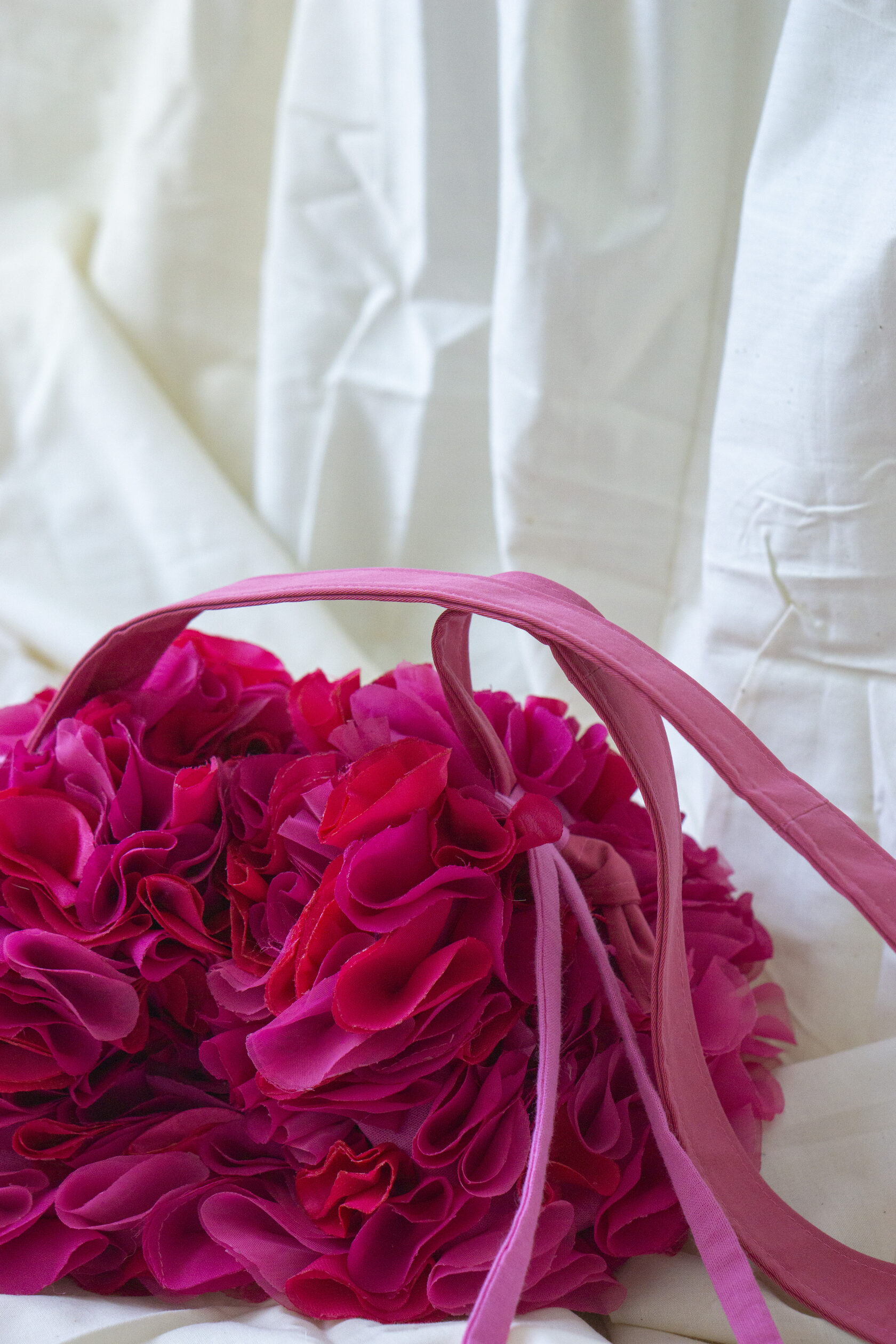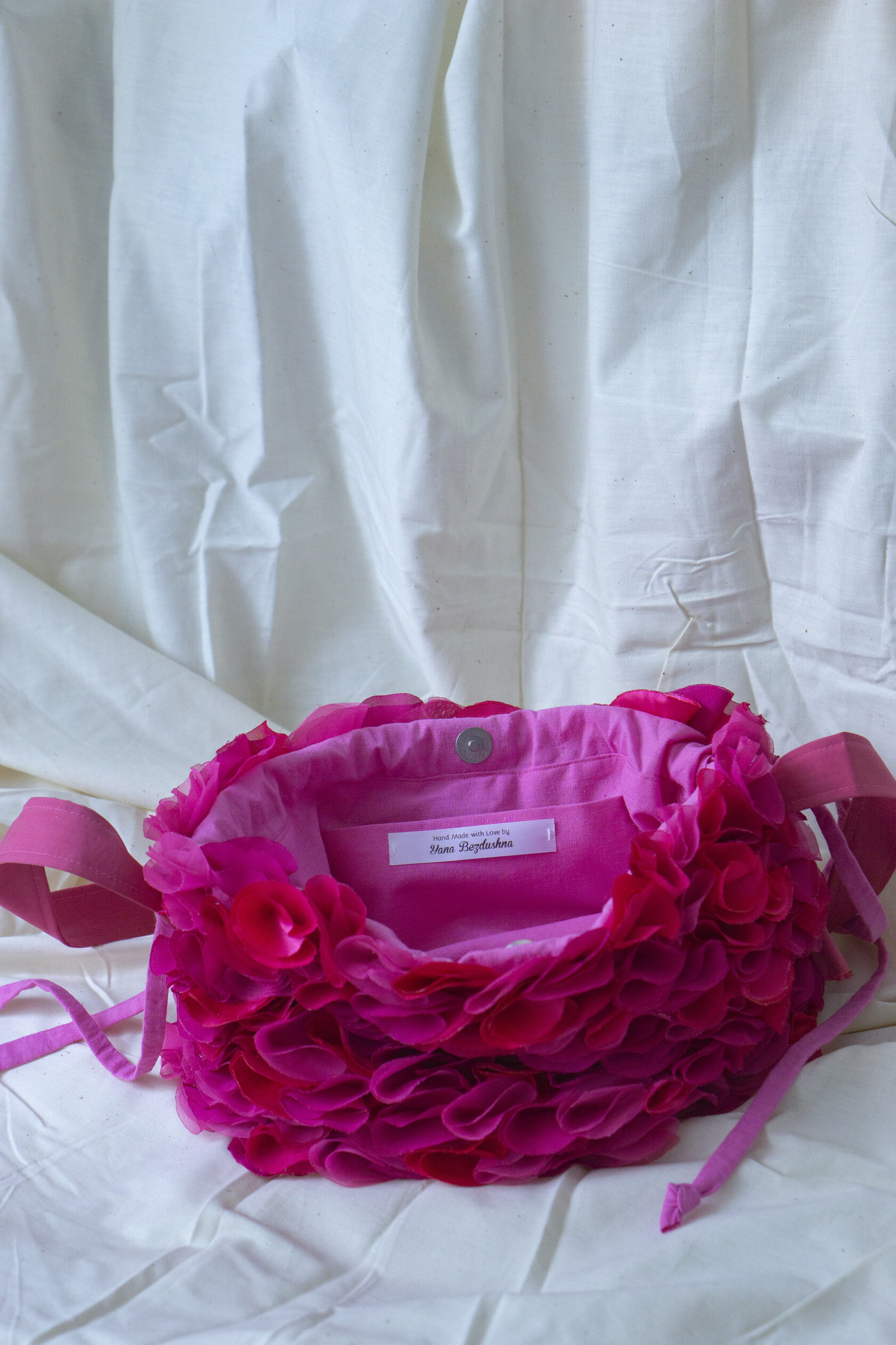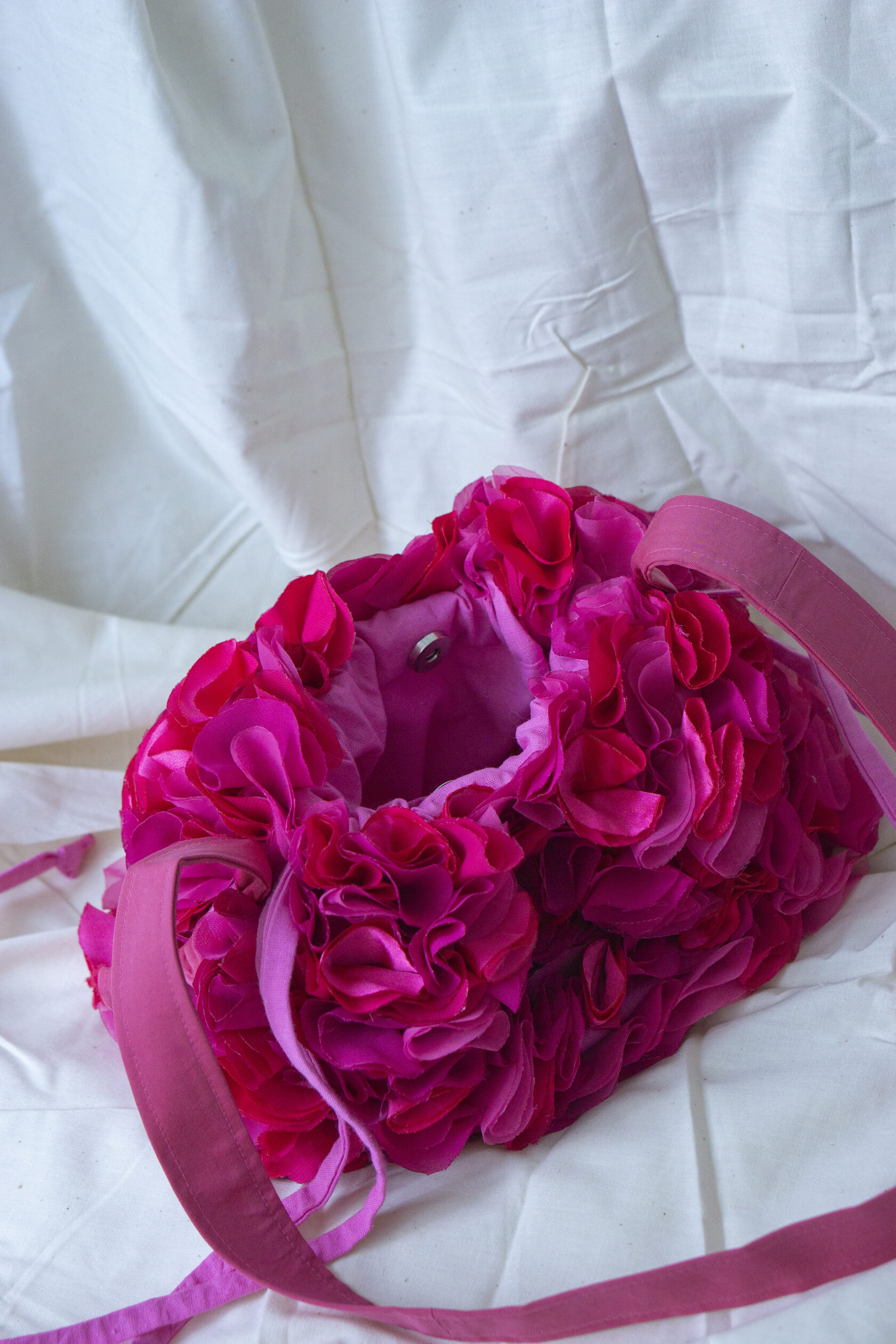 Energetyczna i wyjątkowa! Mała różowa torebka z ręcznie wycinanych okrągłych elementów tkaniny, z magnetycznym zapięciem, sznurkiem na górze i regulowanym paskiem. Idealna dopełnia każdą stylizację odrobiną koloru, kreatywności i charakteru.