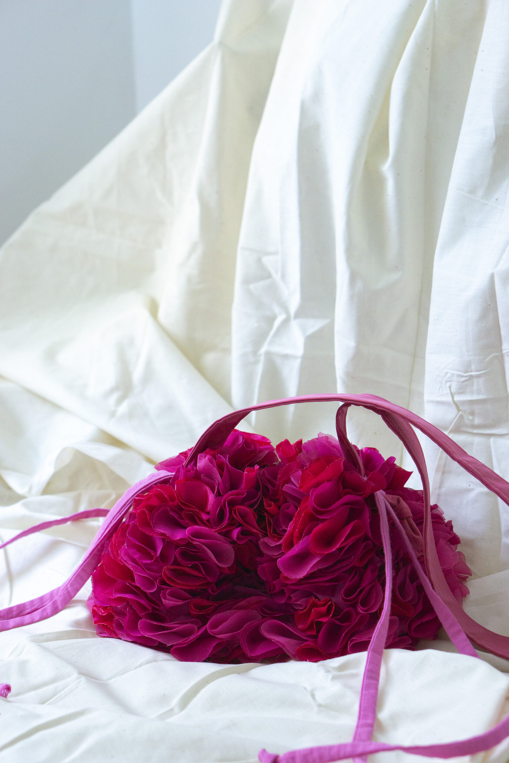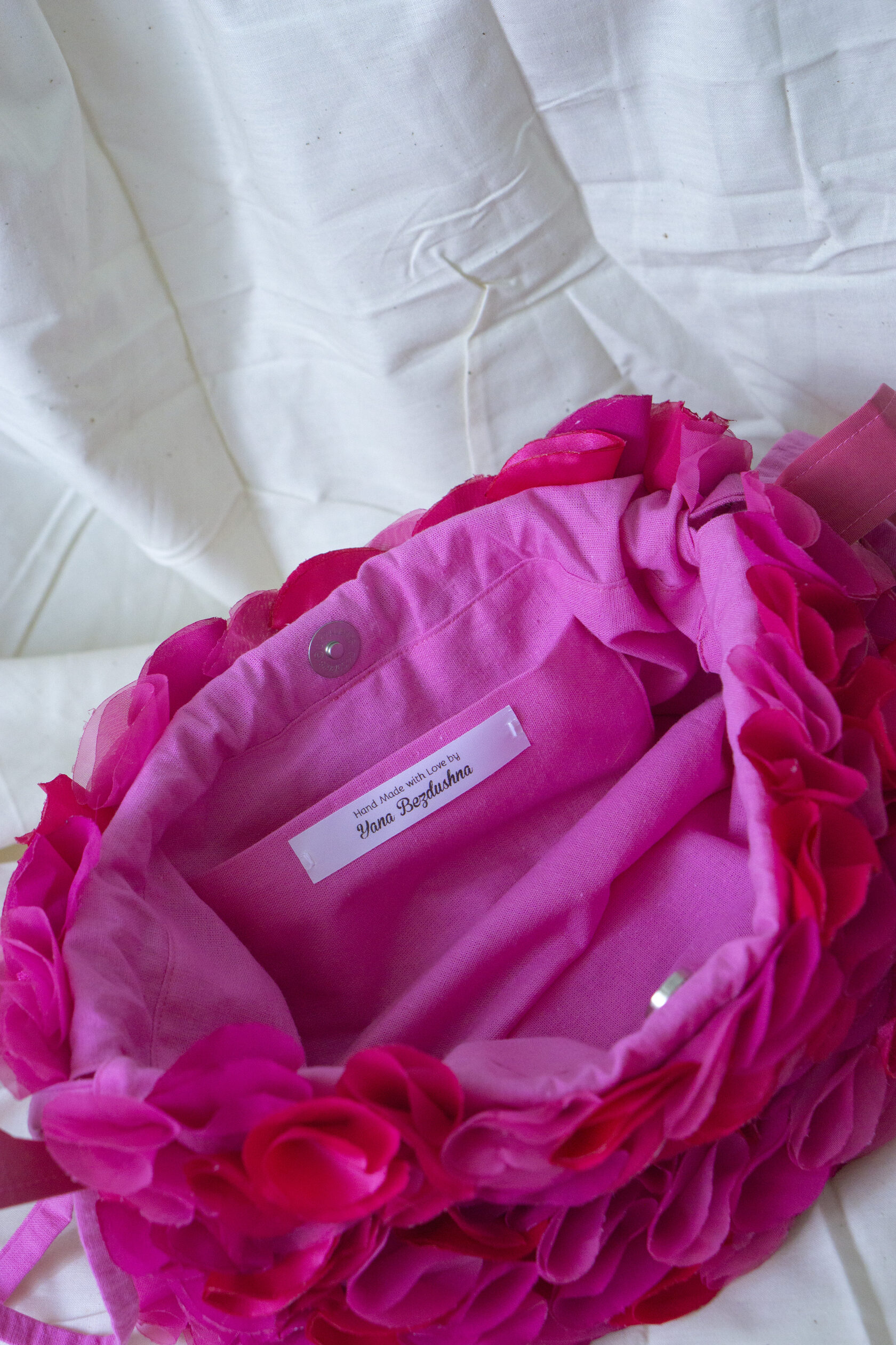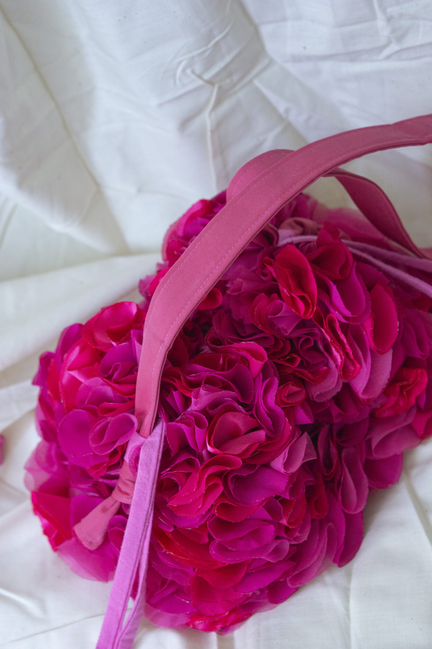 Energetyczna i wyjątkowa! Mała różowa torebka z ręcznie wycinanych okrągłych elementów tkaniny, z magnetycznym zapięciem, sznurkiem na górze i regulowanym paskiem. Idealna dopełnia każdą stylizację odrobiną koloru, kreatywności i charakteru.
