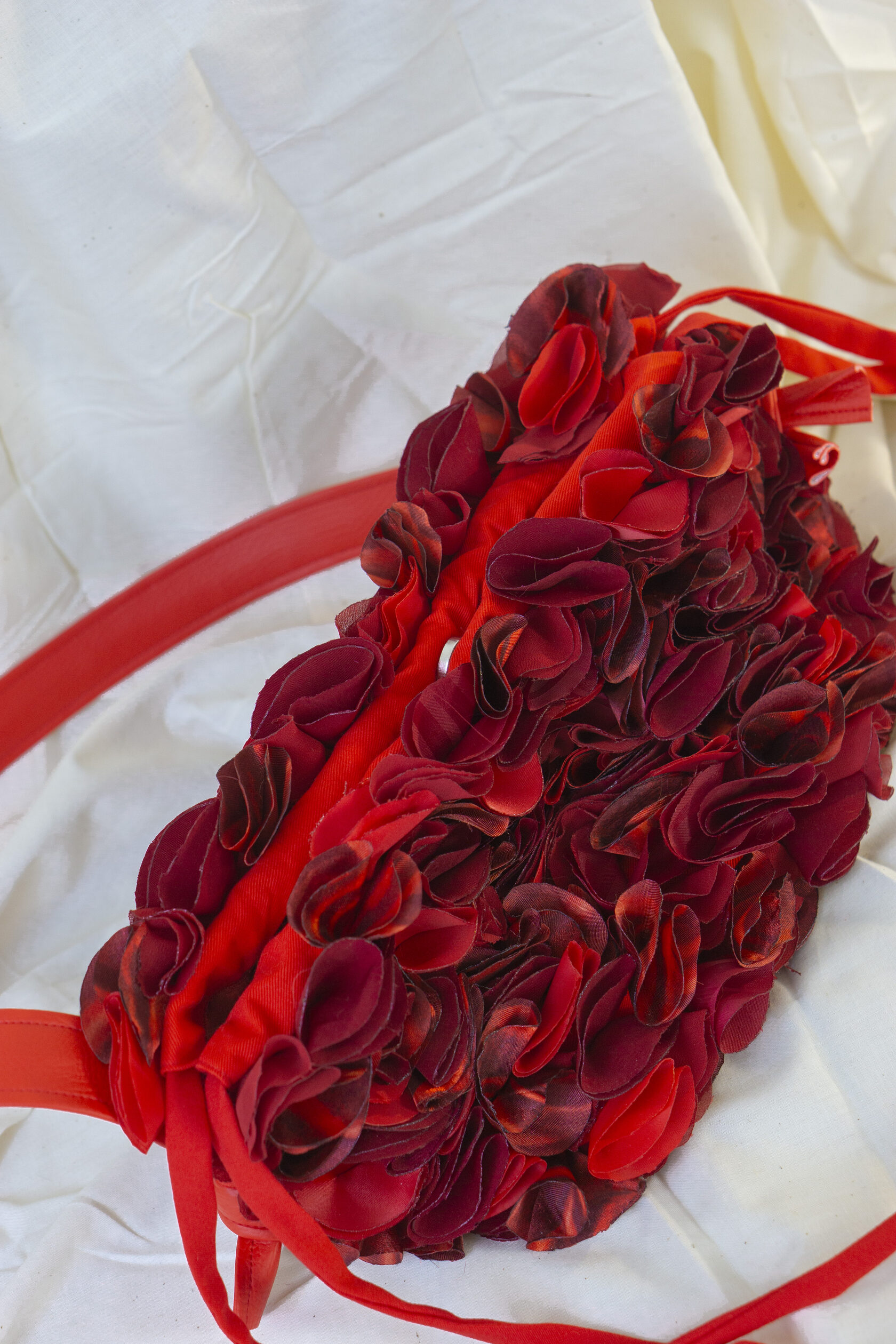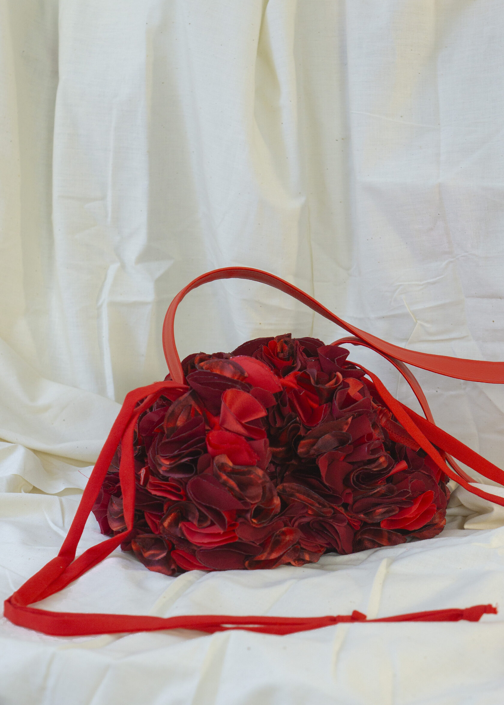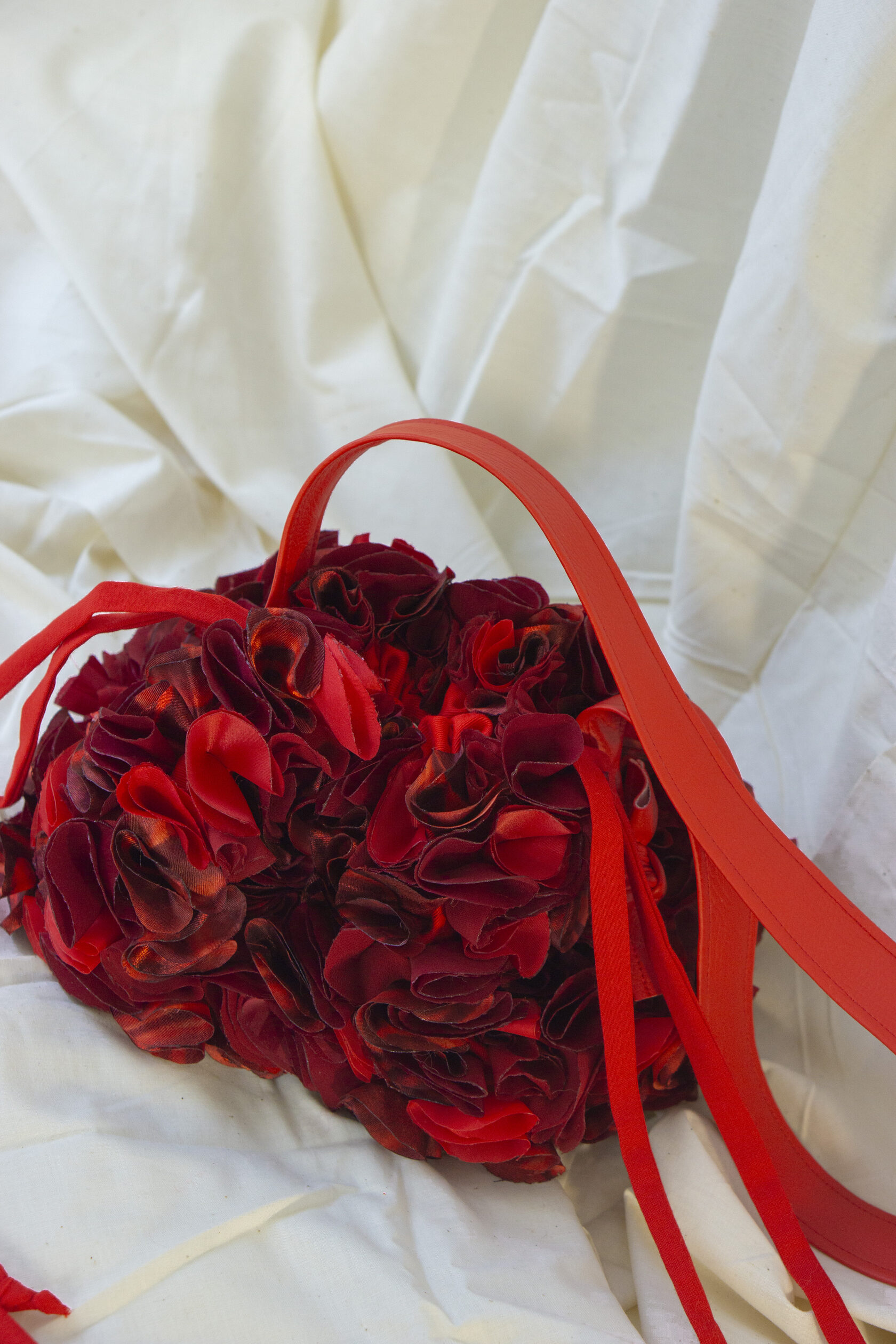 Ta mała czerwona torebka to pełna życia kreacja z upcyklingowanych materiałów, wykonana z ręcznie wycinanych okrągłych elementów tkaniny, starannie ukształtowanych i zestawionych w zabawną, a zarazem elegancką fakturę. Wykonana z odzyskanych materiałów, celebruje zrównoważony rozwój poprzez sztukę i kolor.
