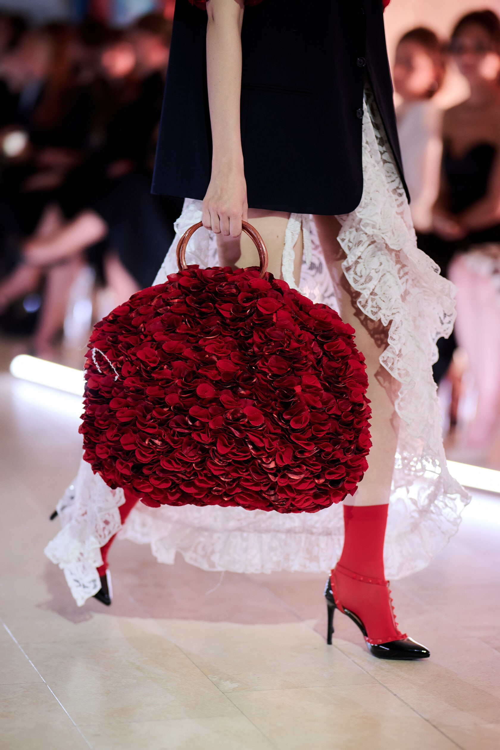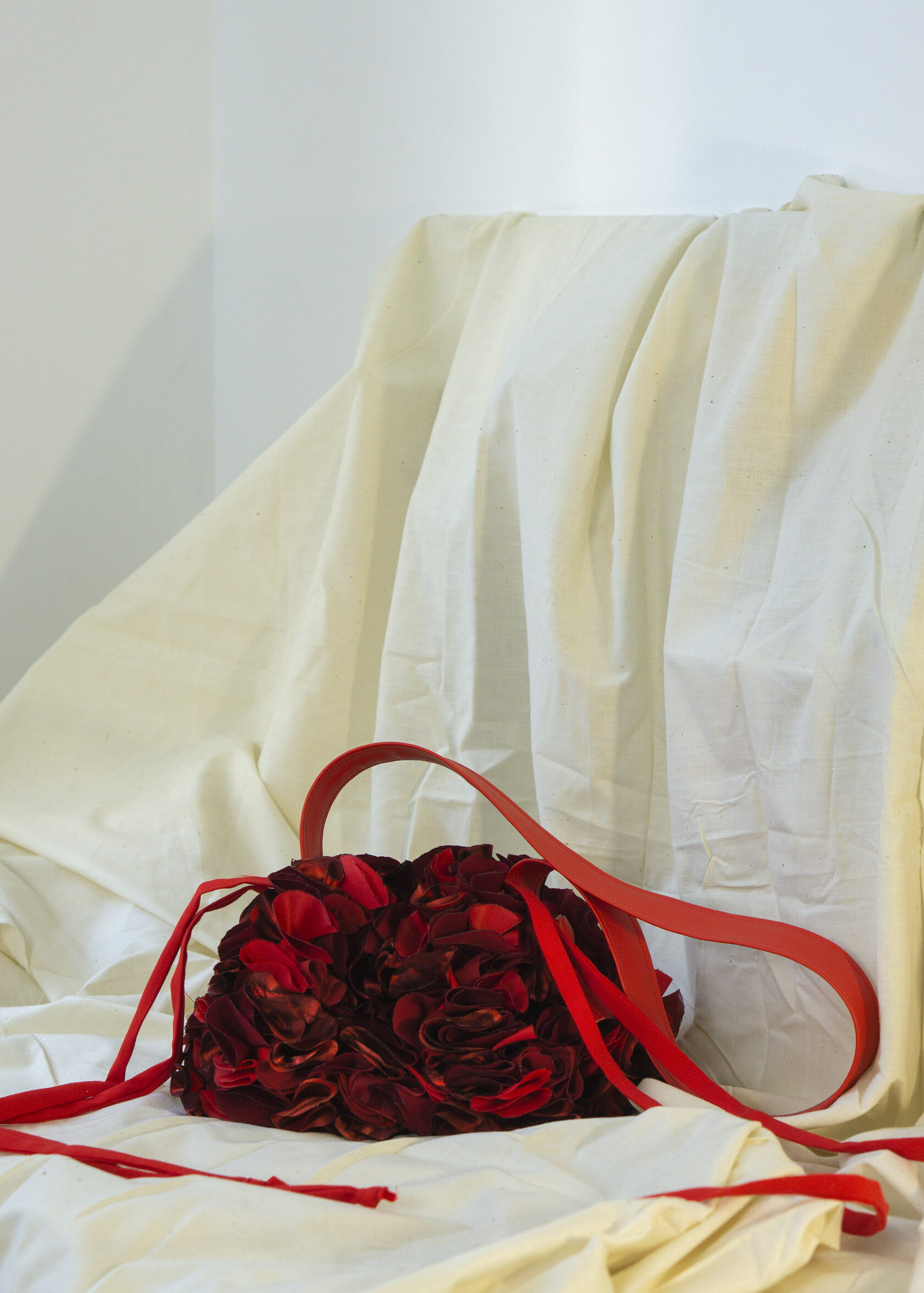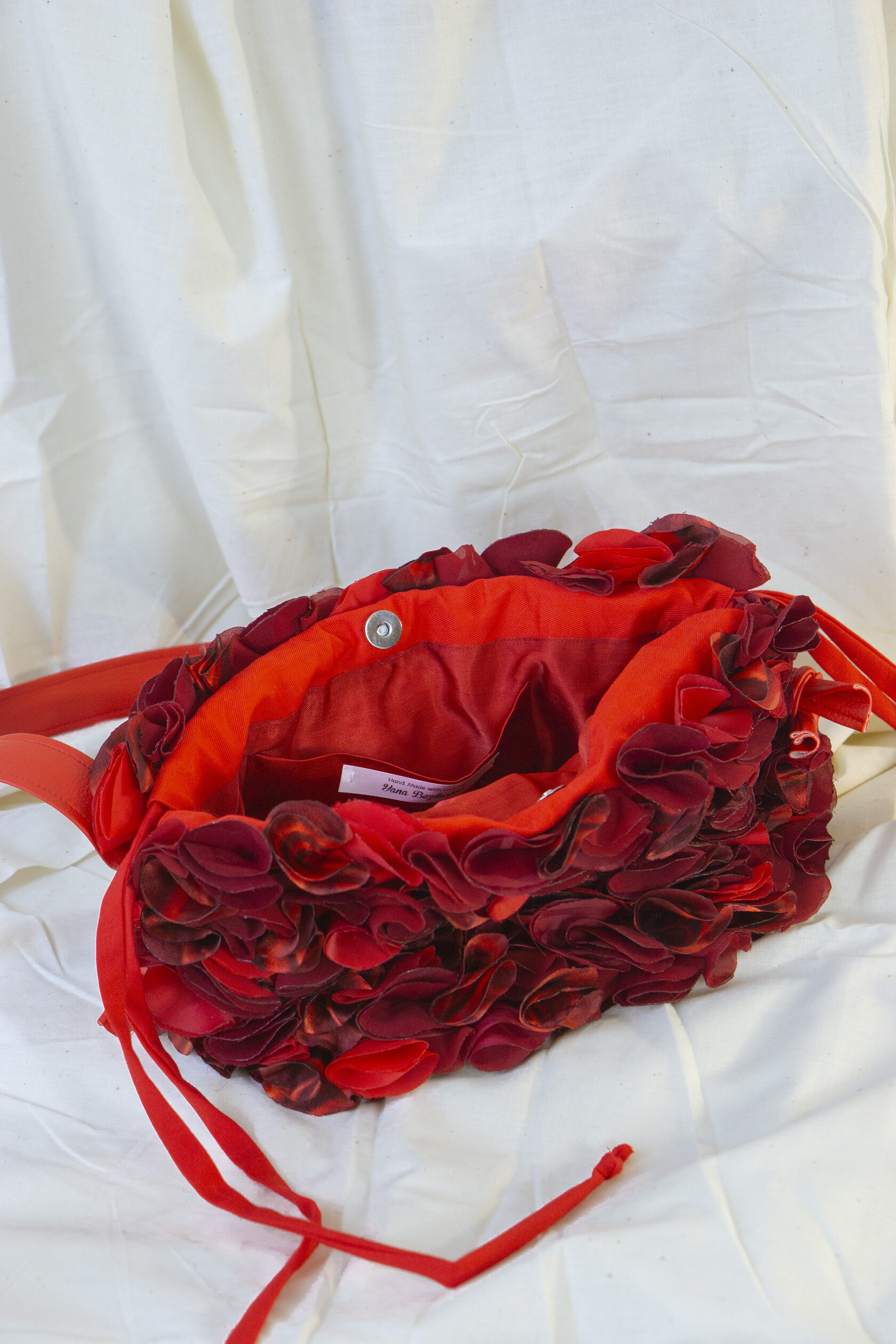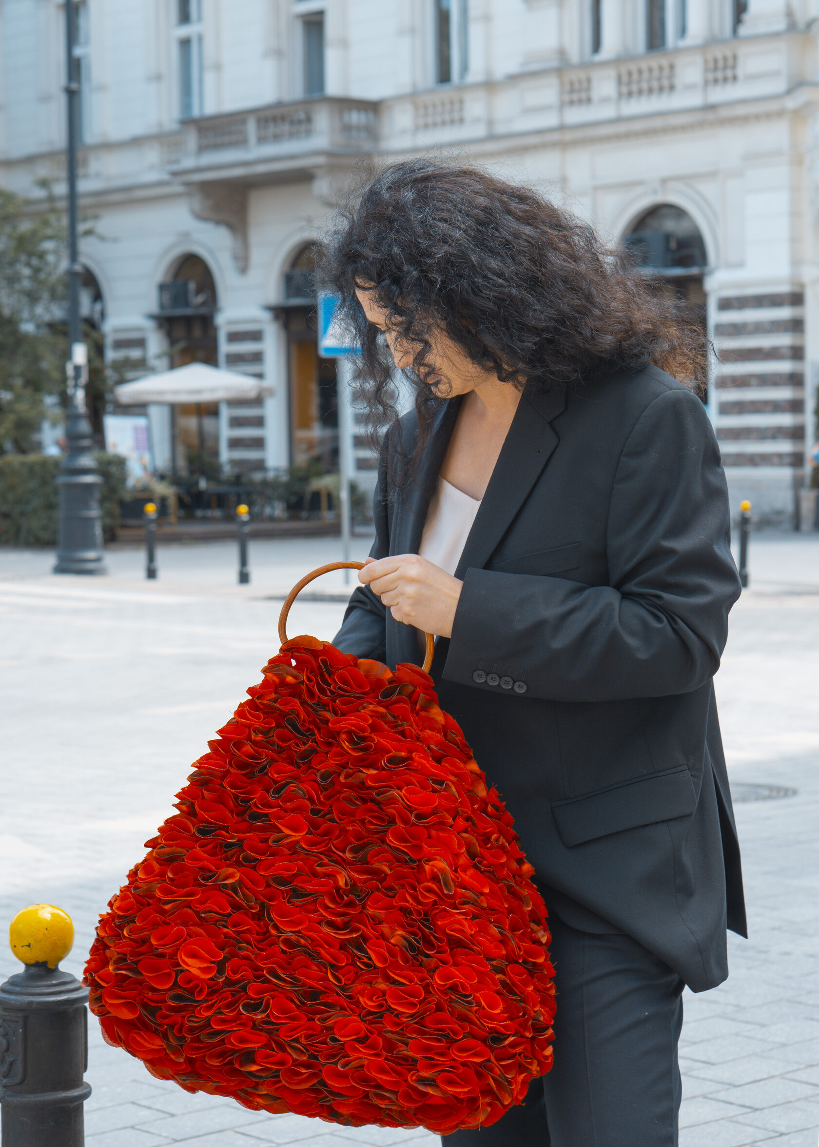 Ta mała czerwona torebka to pełna życia kreacja z upcyklingowanych materiałów, wykonana z ręcznie wycinanych okrągłych elementów tkaniny, starannie ukształtowanych i zestawionych w zabawną, a zarazem elegancką fakturę. Wykonana z odzyskanych materiałów, celebruje zrównoważony rozwój poprzez sztukę i kolor.