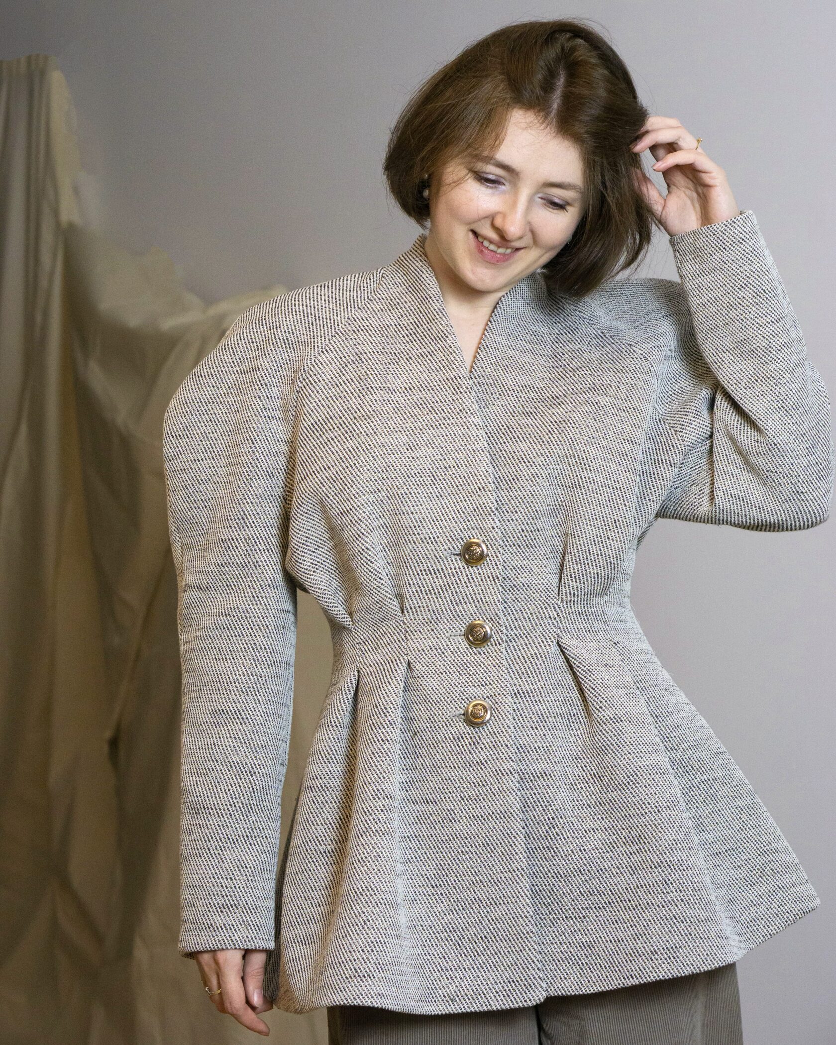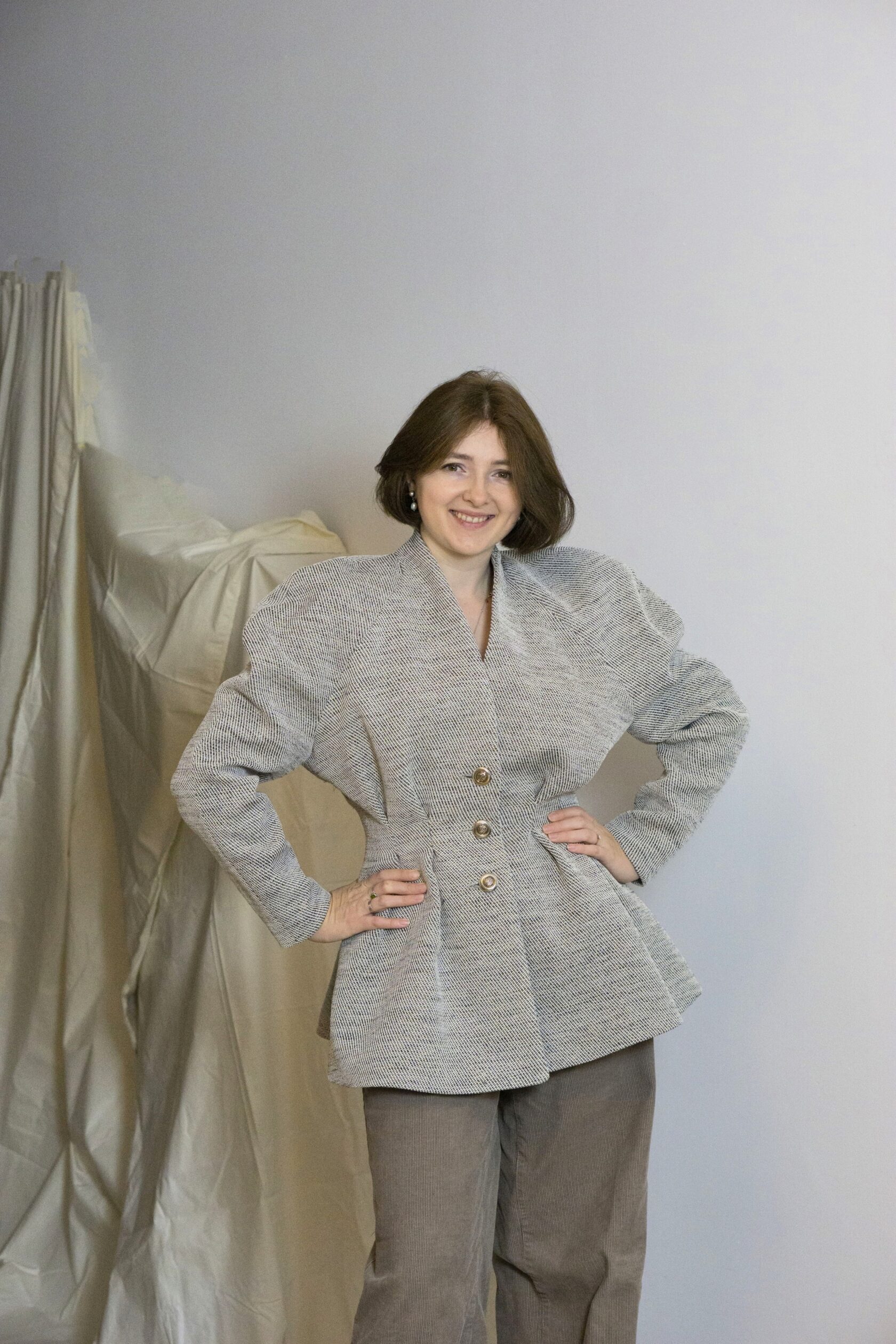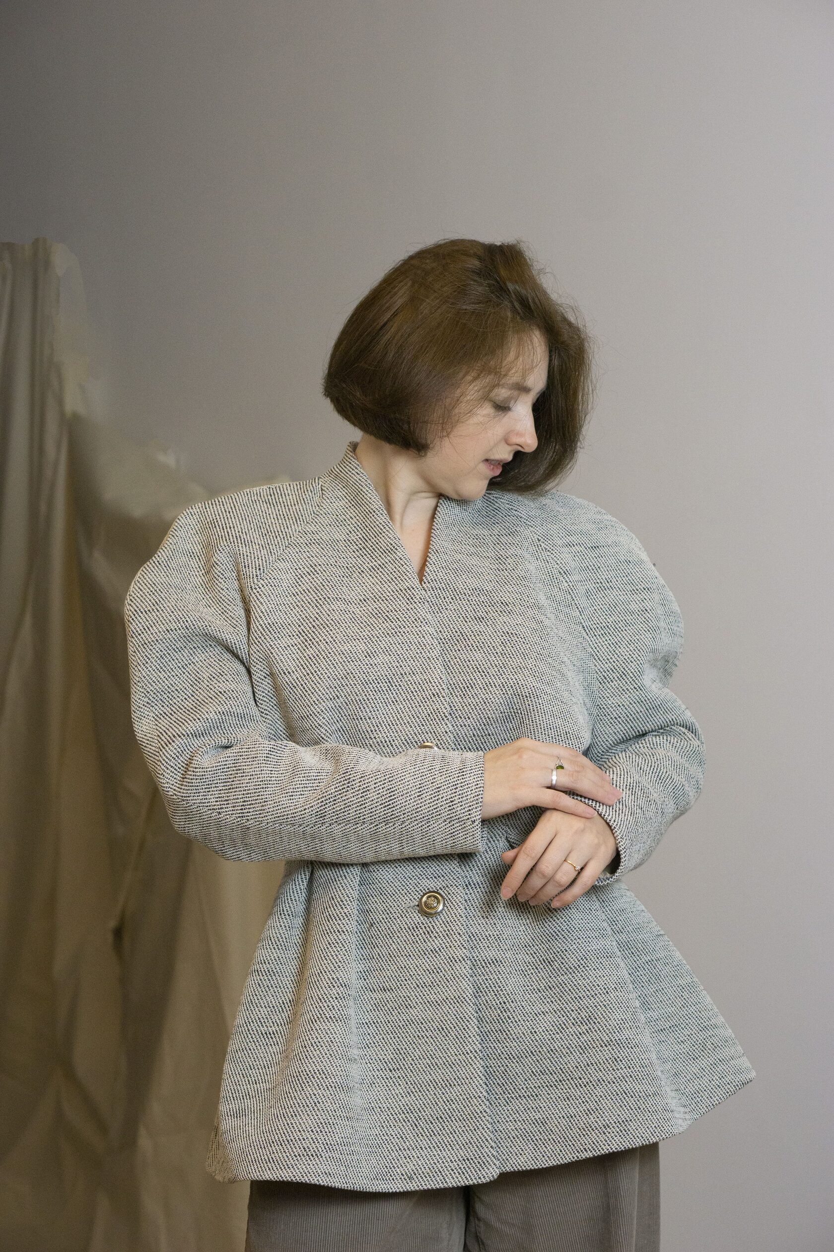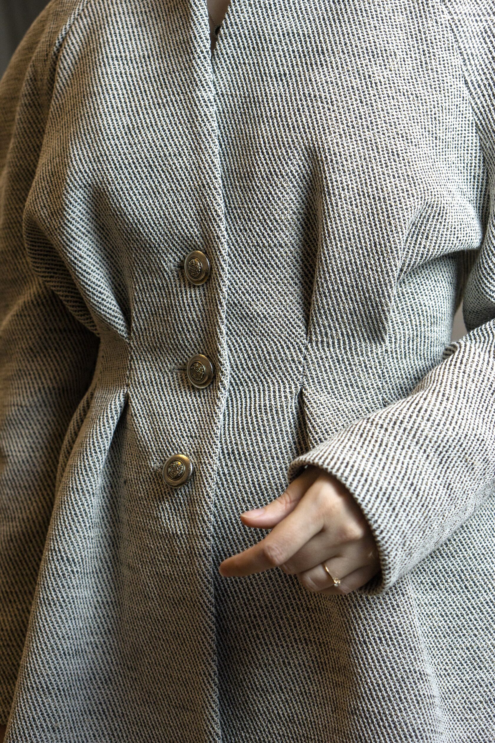 Ręcznie wykonana marynarka z tkanin IKEA, stworzona w duchu upcyclingu i zrównoważonej mody. Klasyczna forma została przełamana nowoczesnym krojem i subtelną strukturą materiału.