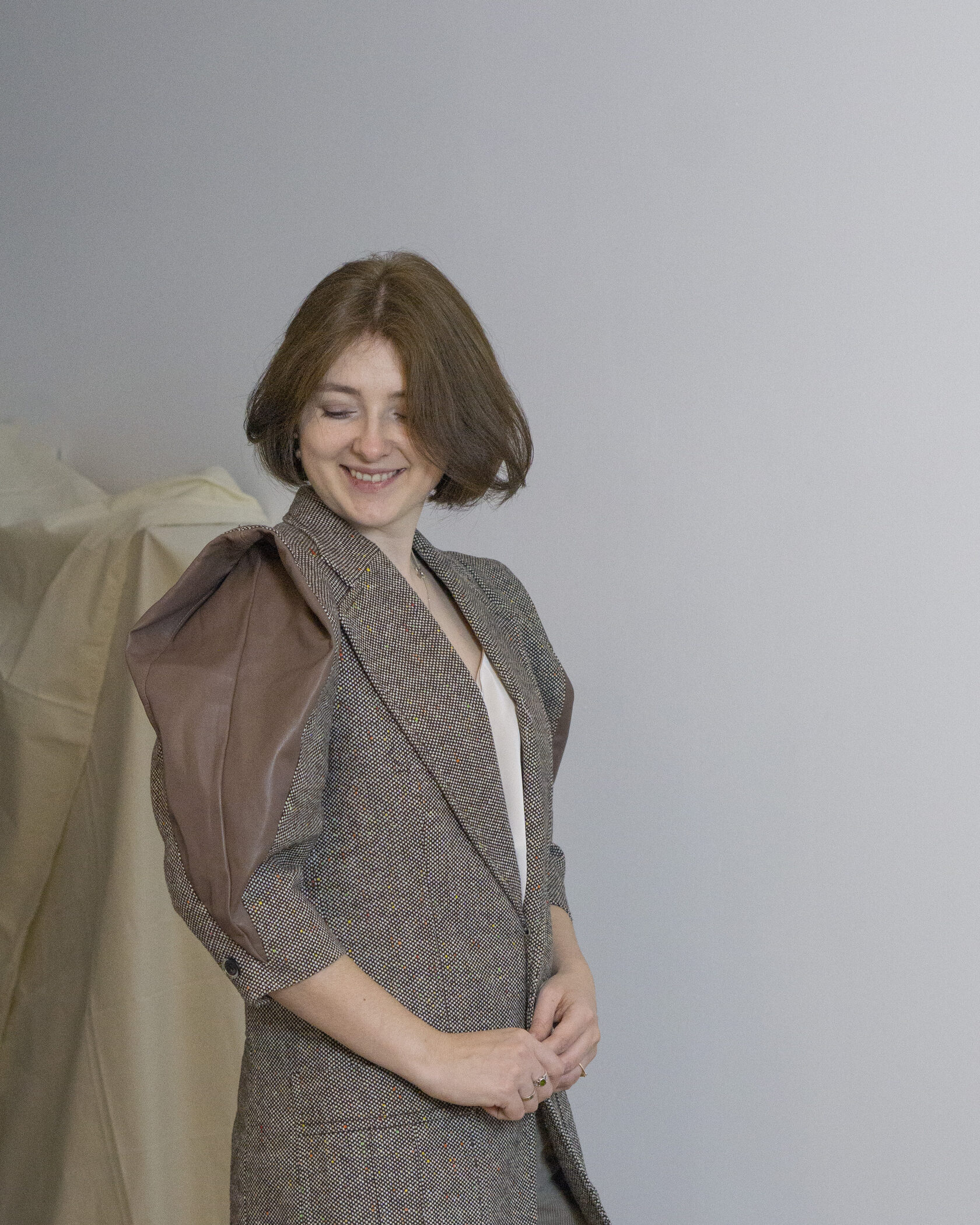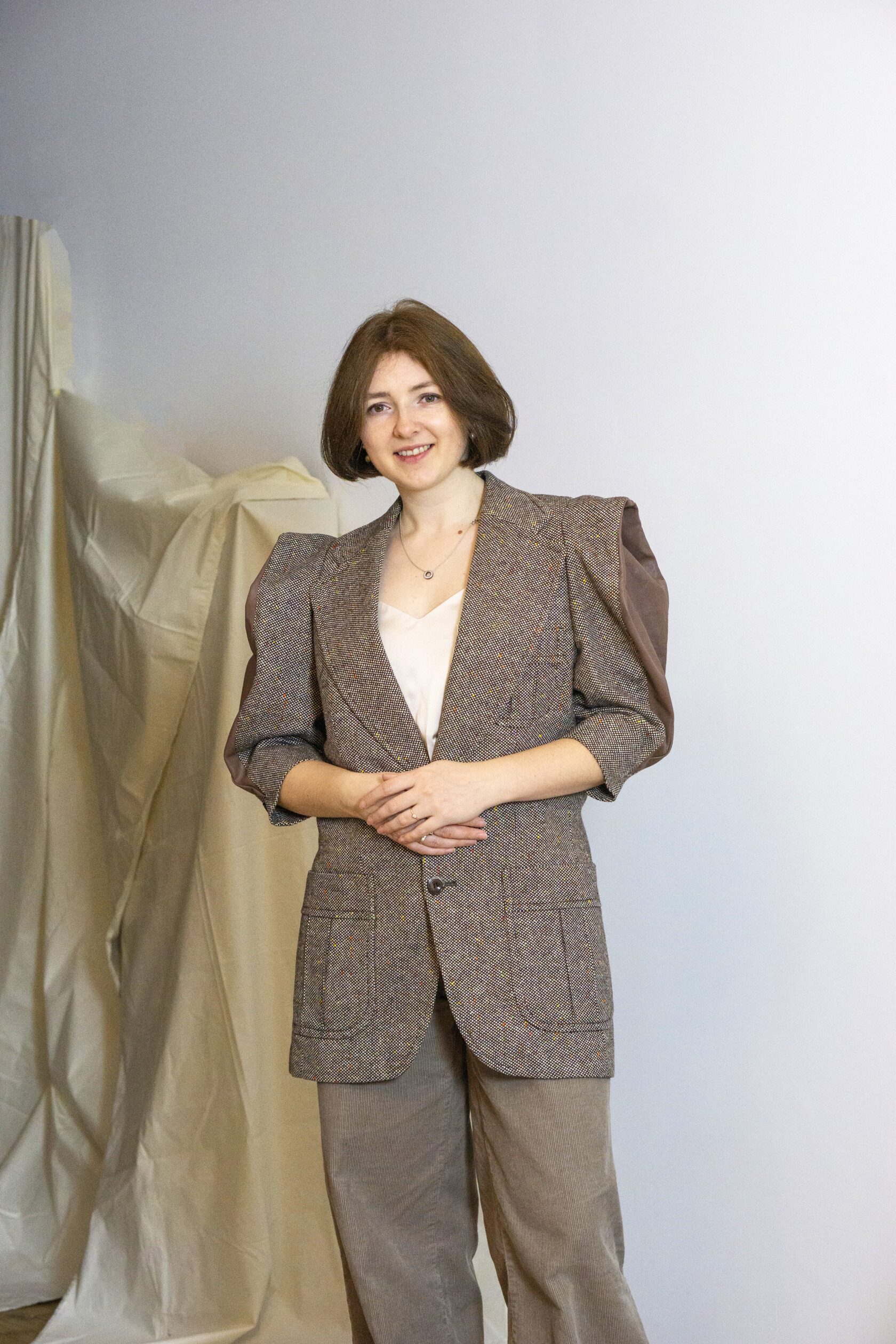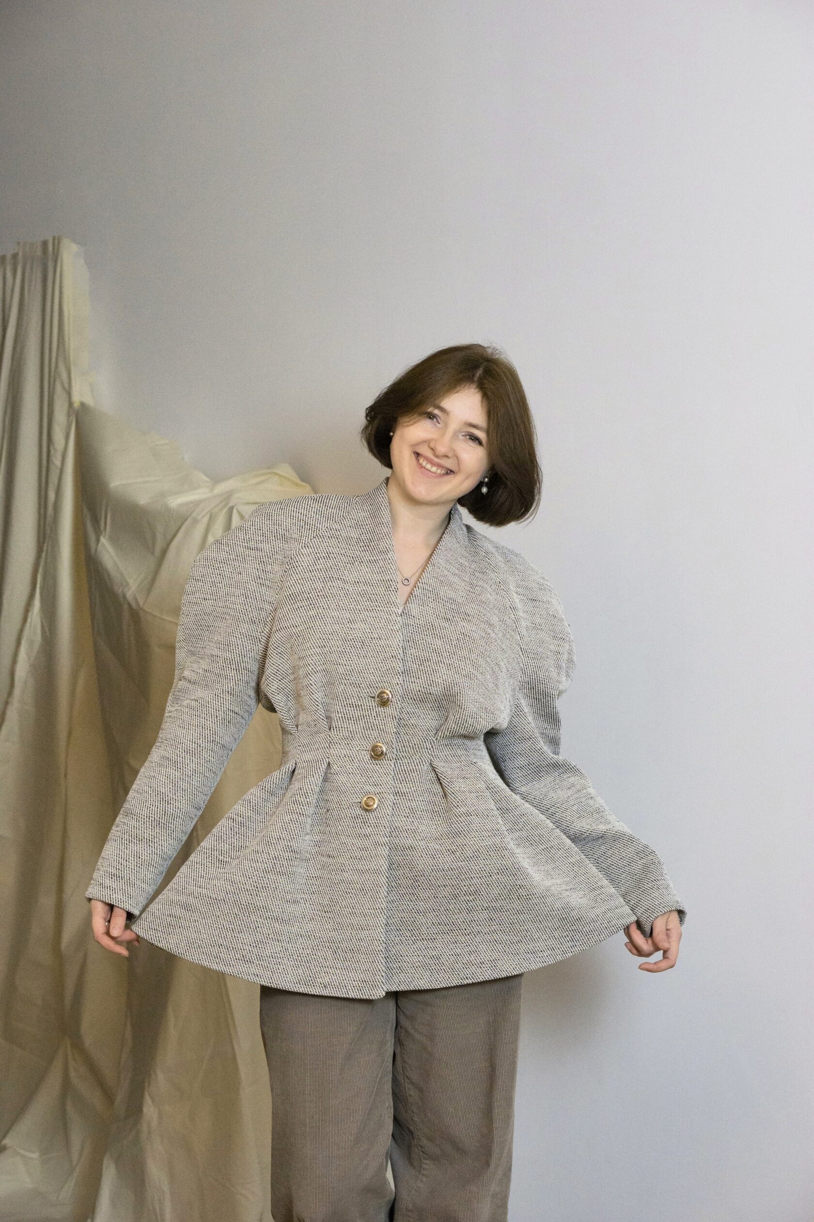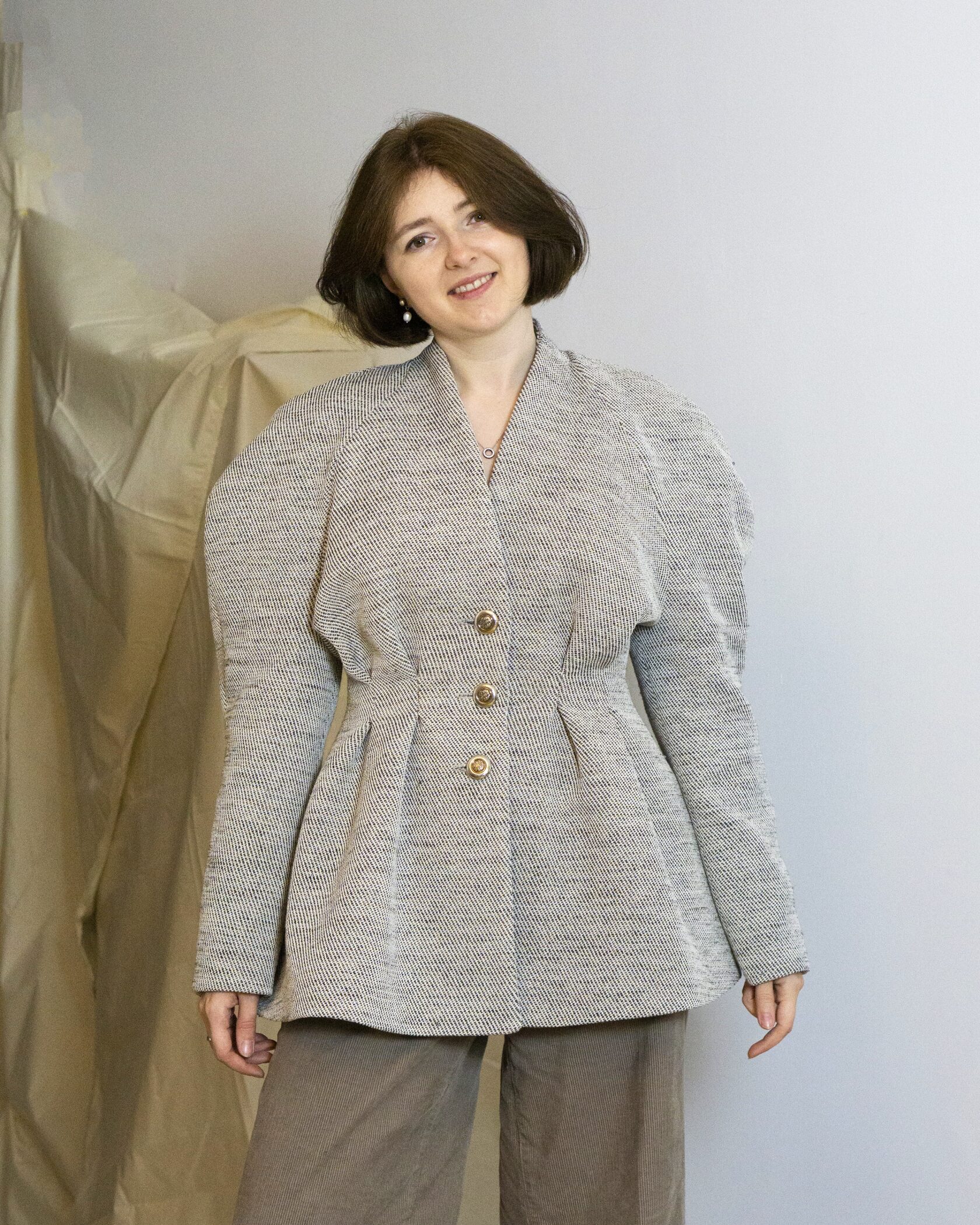 Ręcznie wykonana marynarka z tkanin IKEA, stworzona w duchu upcyclingu i zrównoważonej mody. Klasyczna forma została przełamana nowoczesnym krojem i subtelną strukturą materiału.