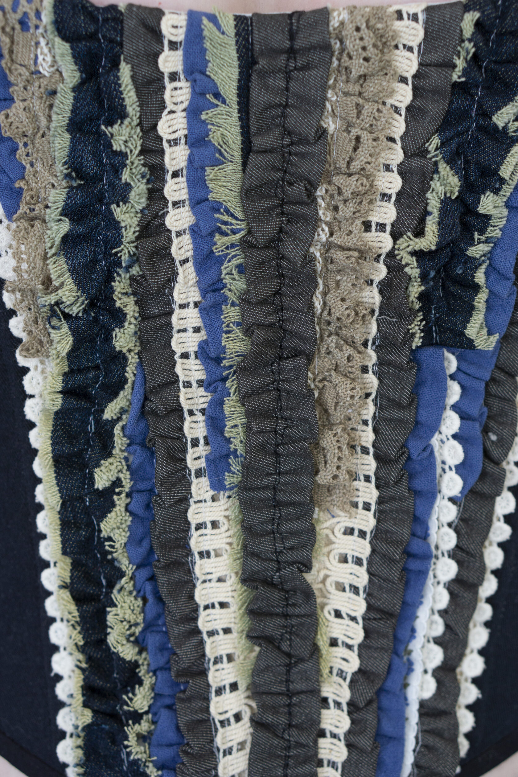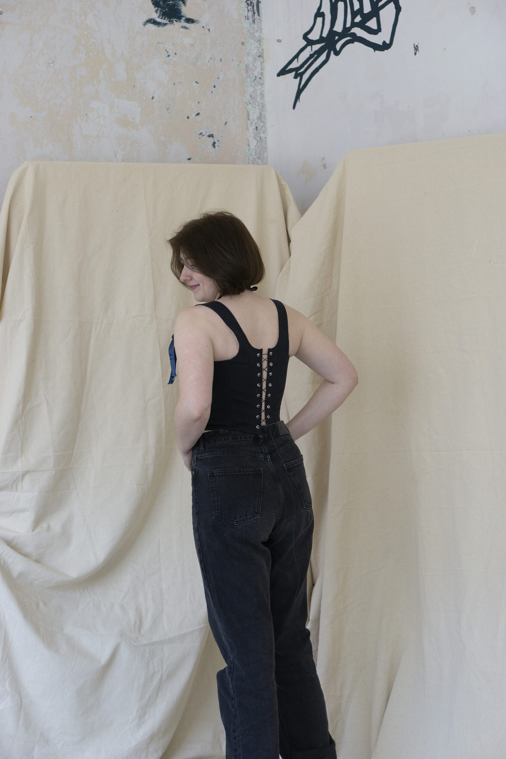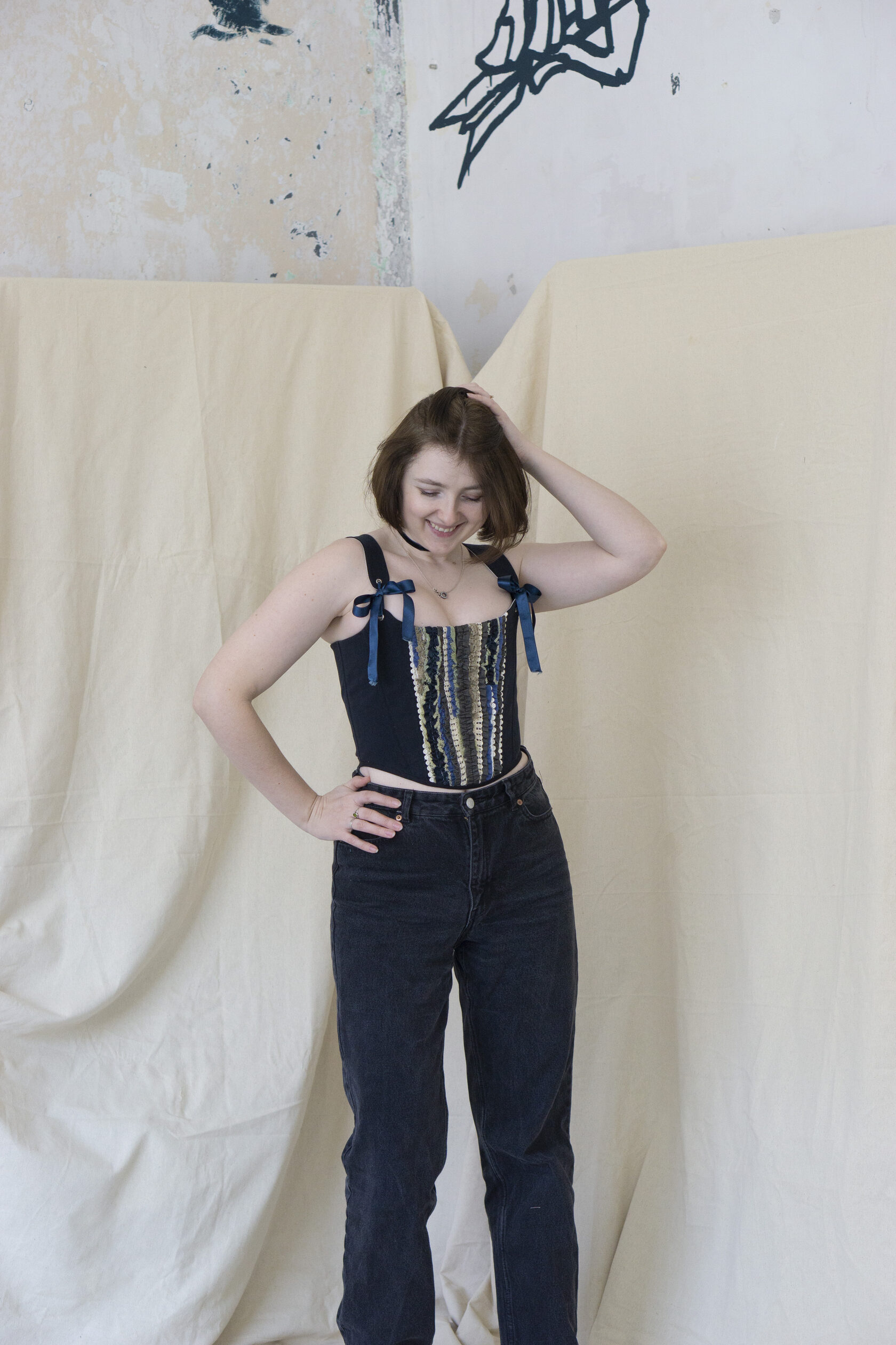 Ten upcyklingowany gorset dżinsowy to element, który przyciąga wzrok – esencja rzemiosła, zrównoważonego rozwoju i sztuki. Stworzony z recyklingowych dżinsów, zachowuje autentyczny charakter i teksturę "żywego" denimu, jednocześnie zyskując rzeźbiarską, współczesną sylwetkę.