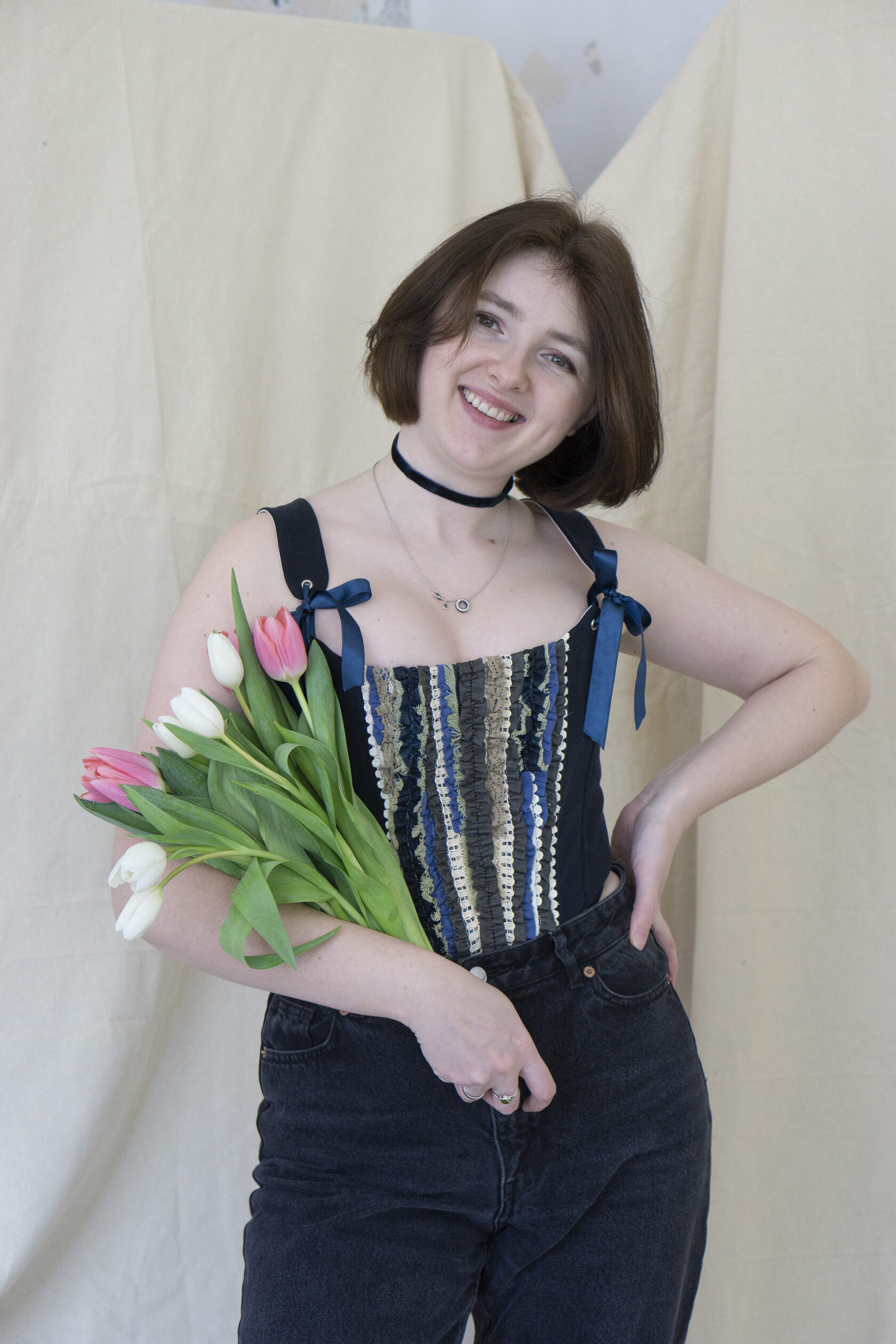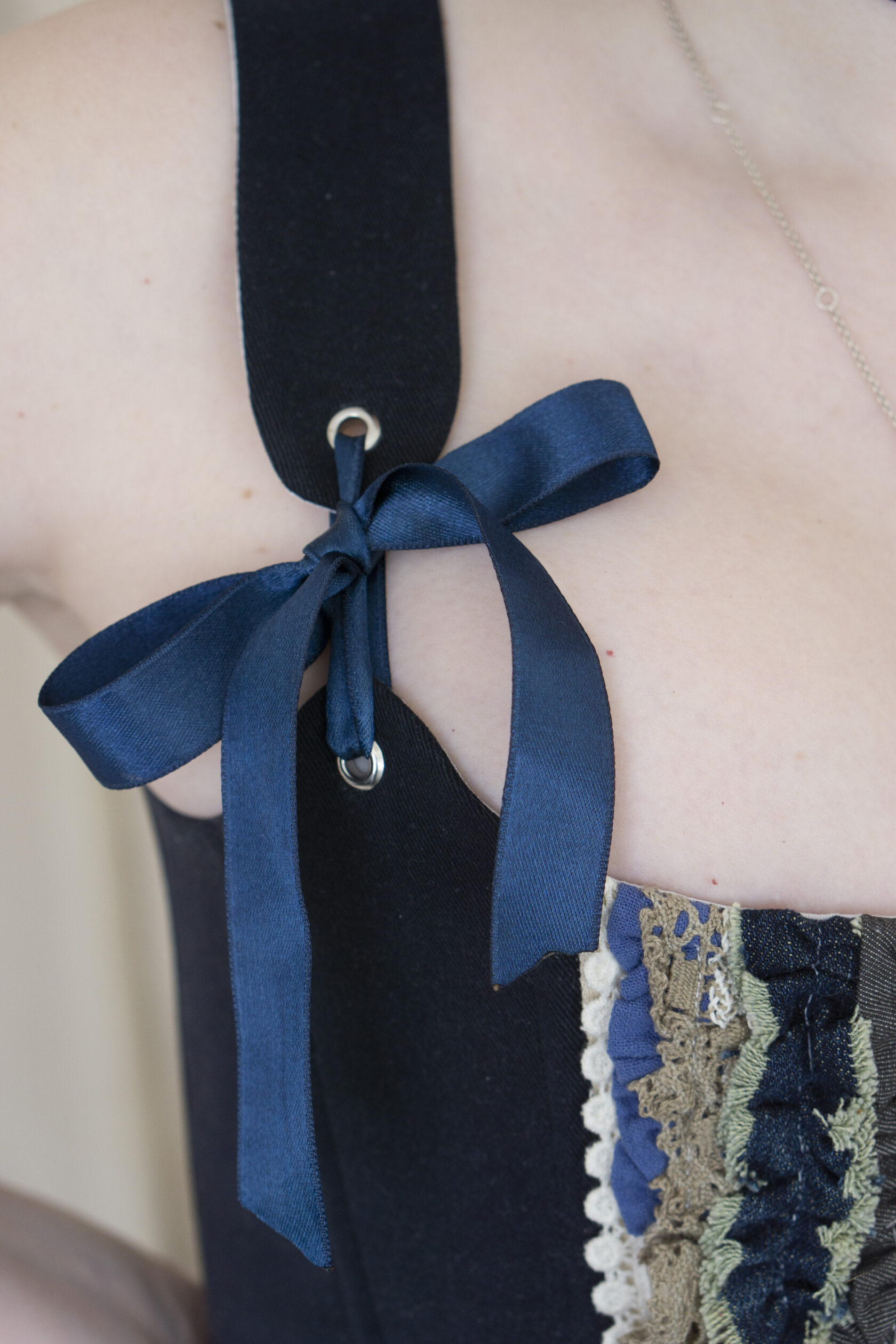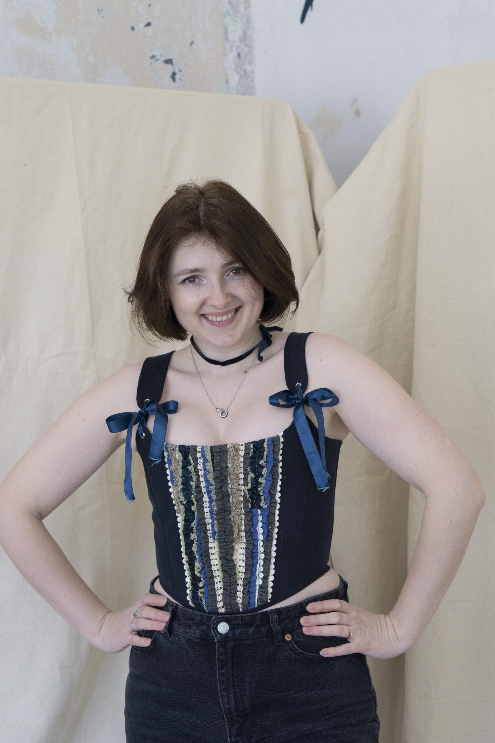 Ten upcyklingowany gorset dżinsowy to element, który przyciąga wzrok – esencja rzemiosła, zrównoważonego rozwoju i sztuki. Stworzony z recyklingowych dżinsów, zachowuje autentyczny charakter i teksturę "żywego" denimu, jednocześnie zyskując rzeźbiarską, współczesną sylwetkę.