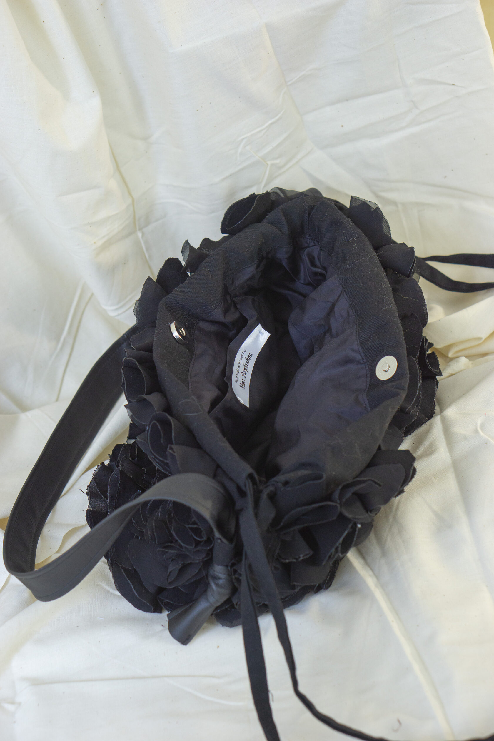 Czarna torba pełna życia! Ręcznie wykonana z upcyklingowanych tkanin, z magnetycznym zapięciem, sznurkiem na górze i długim paskiem. Kompaktowa, wyrazista i wyjątkowa — dodaj koloru i charakteru swojej stylizacji!